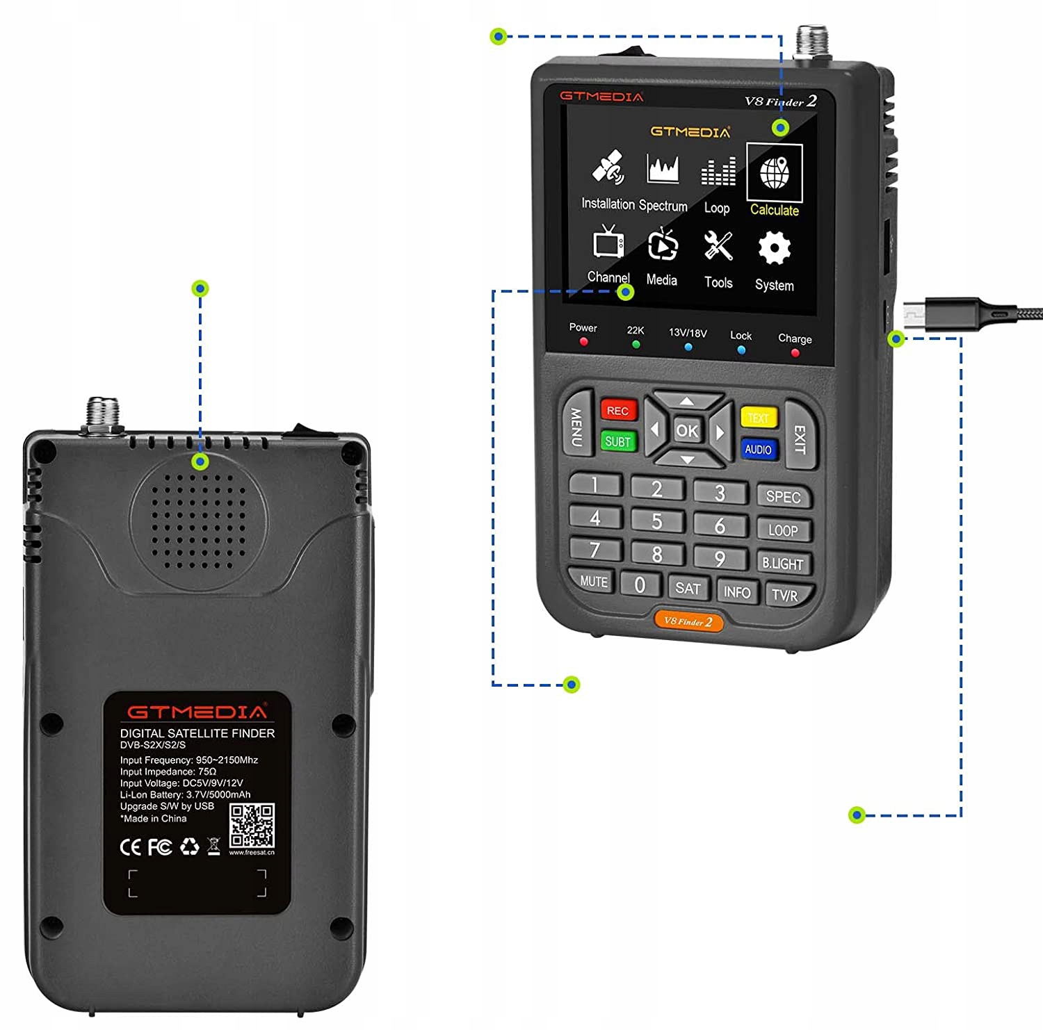 - Пошук супутників V8 Finder2, вбудований акумулятор 7,4 В/4000 мАг може забезпечити приблизно 4- На 6 годиндовший робочий час.