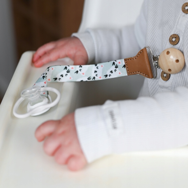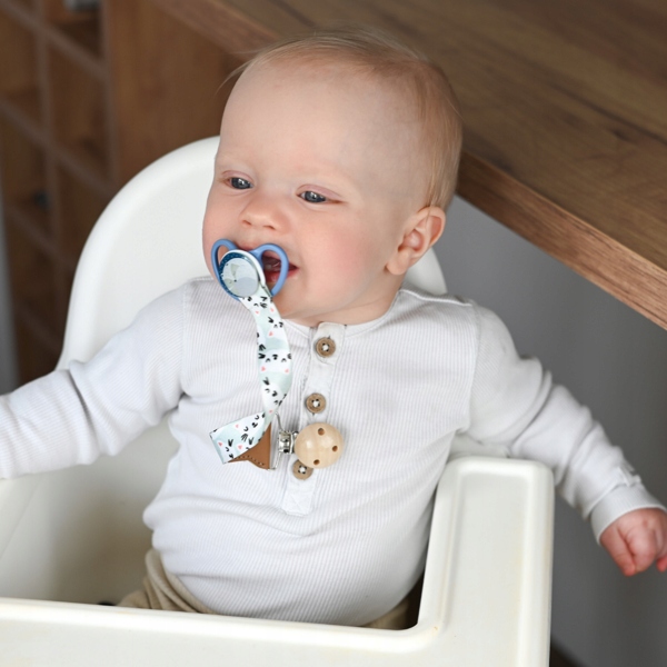 Просто повісьте соску на одну сторону стрічки, а іншу сторону затискачем прикріпіть до одягу дитини, і все готово!