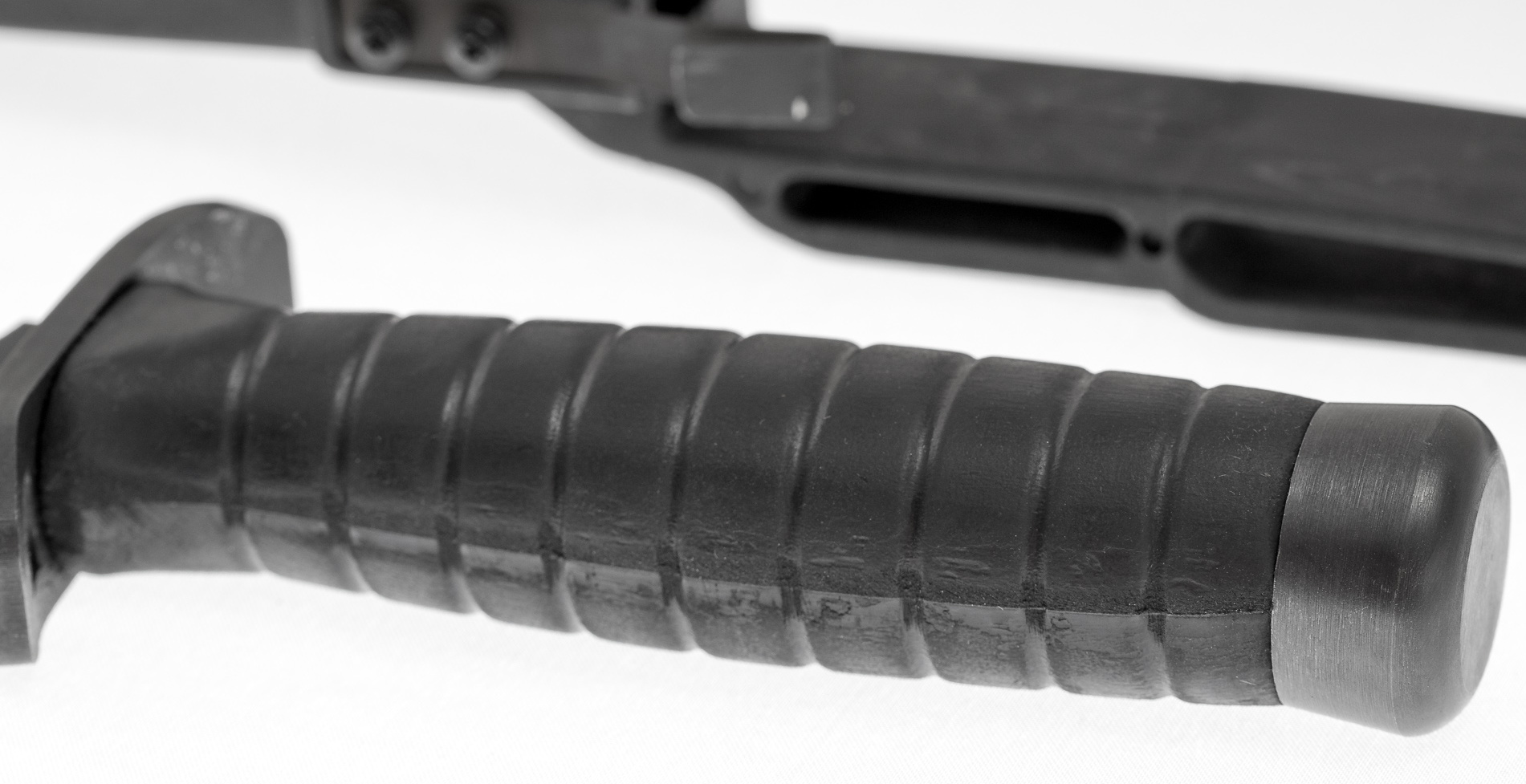 Ніж переноситься в міцних пластикових піхвах з двома вушками для протягування ременя та двома меншими з нейлоновою мотузкою для. підвішування або кріплення до стегна.