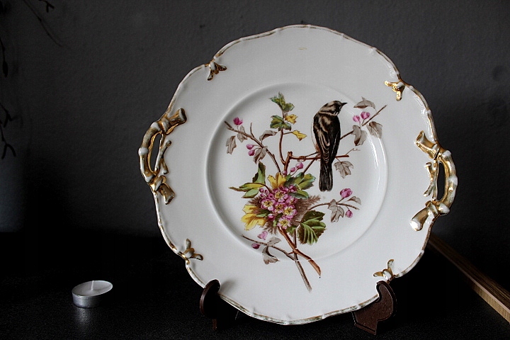 ПОСТАРЕНА ТАРІЛКА З РУЧКАМИ, ПОЗОЛОЧЕННЯ БІЛОЮ ПЕРЦЕЛЯНОЮ, РЕЛЬІФ, ДЕКОР-ПТАШКА НА ГІЛЦІ