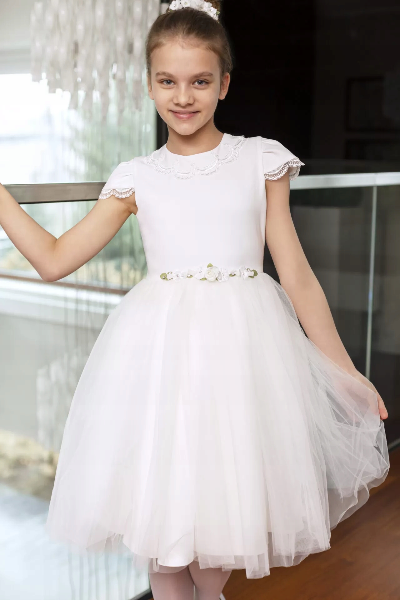 Елегантна сукня кольору екрю. Прикрашена ніжним мереживом, яке видно на рукавах і декольте. Сукня має довгу стрічку з квітами на талії.