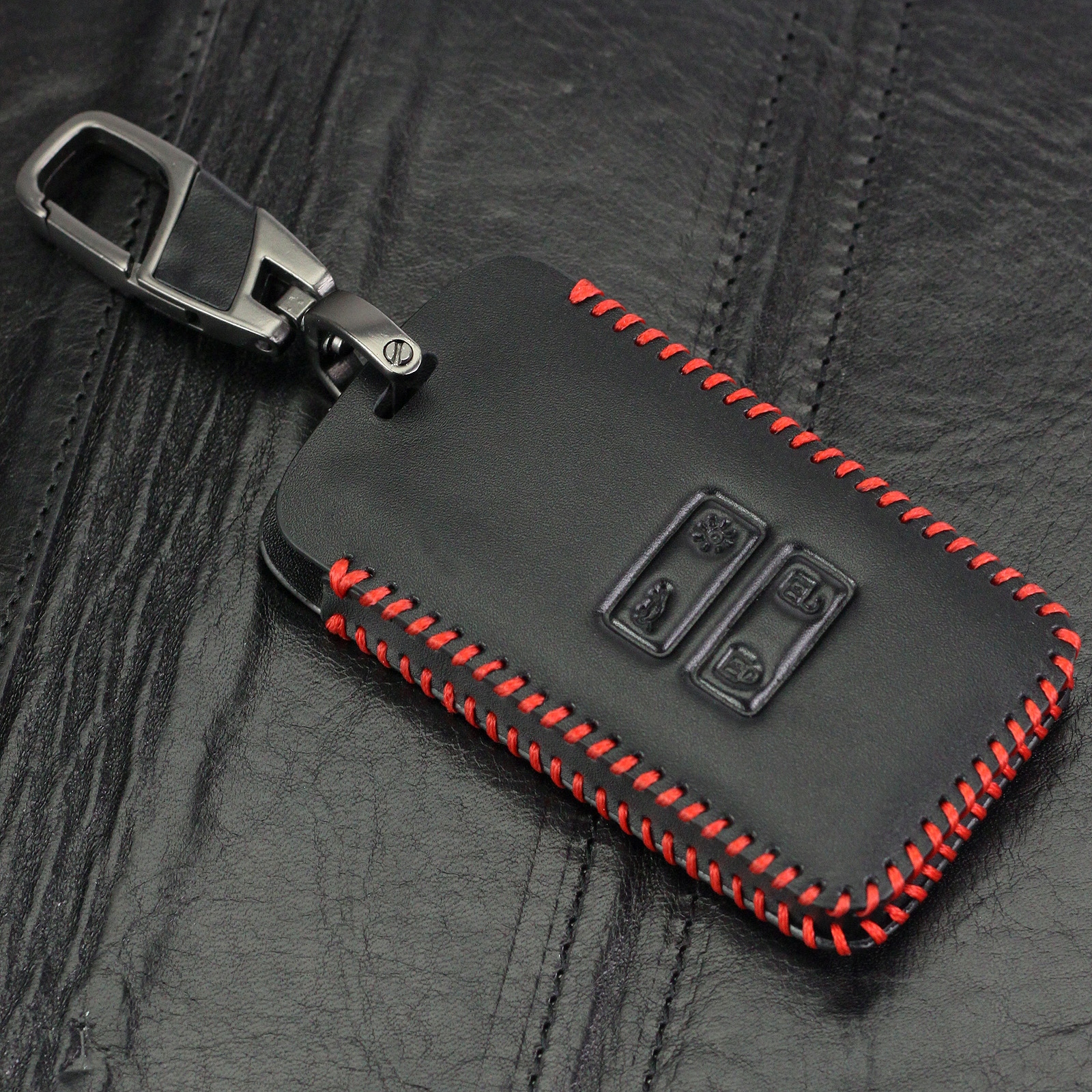 Ми пропонуємо зшиті вручну футляри для ключів усіх марок і моделей легкових автомобілів тощо. Ключі виготовлені з натуральної чорної шкіри, прошиті товстою червоною ниткою Кожен футляр оснащений практичним сталевим карабіном, лакованим титановим кольором.