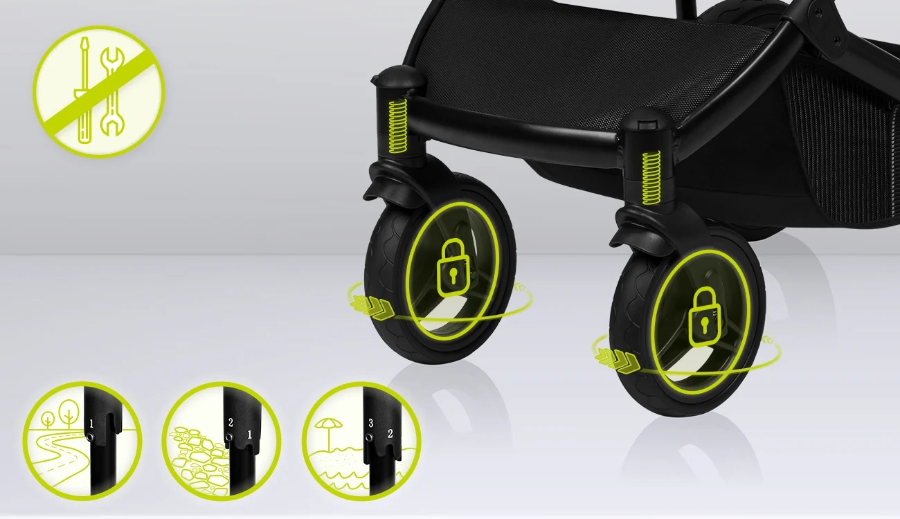 Великі колеса та зручна амортизація. Комфортні позашляхові колеса не потребують технічного обслуговування та обертаються на 360 футів. Їх можна заблокувати для руху прямо. Їх діаметр 27 см, ширина 5 см і глибокий протектор забезпечують легке керування коляскою Lionelo Mari Tour 3in1 Black Onyx навіть на піщаних ділянках або ґрунтових дорогах. Центральні амортизатори забезпечують додатковий комфорт для вашої дитини, для чого ви можете вибрати 1 з 3 рівнів жорсткості.