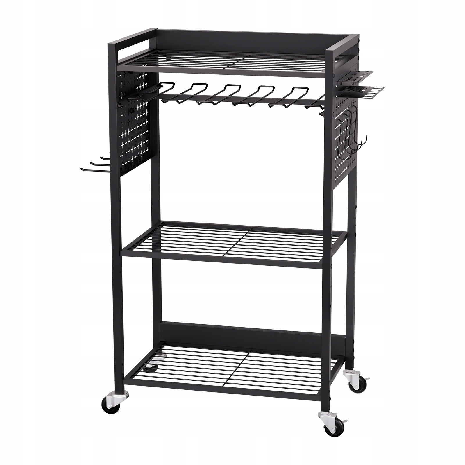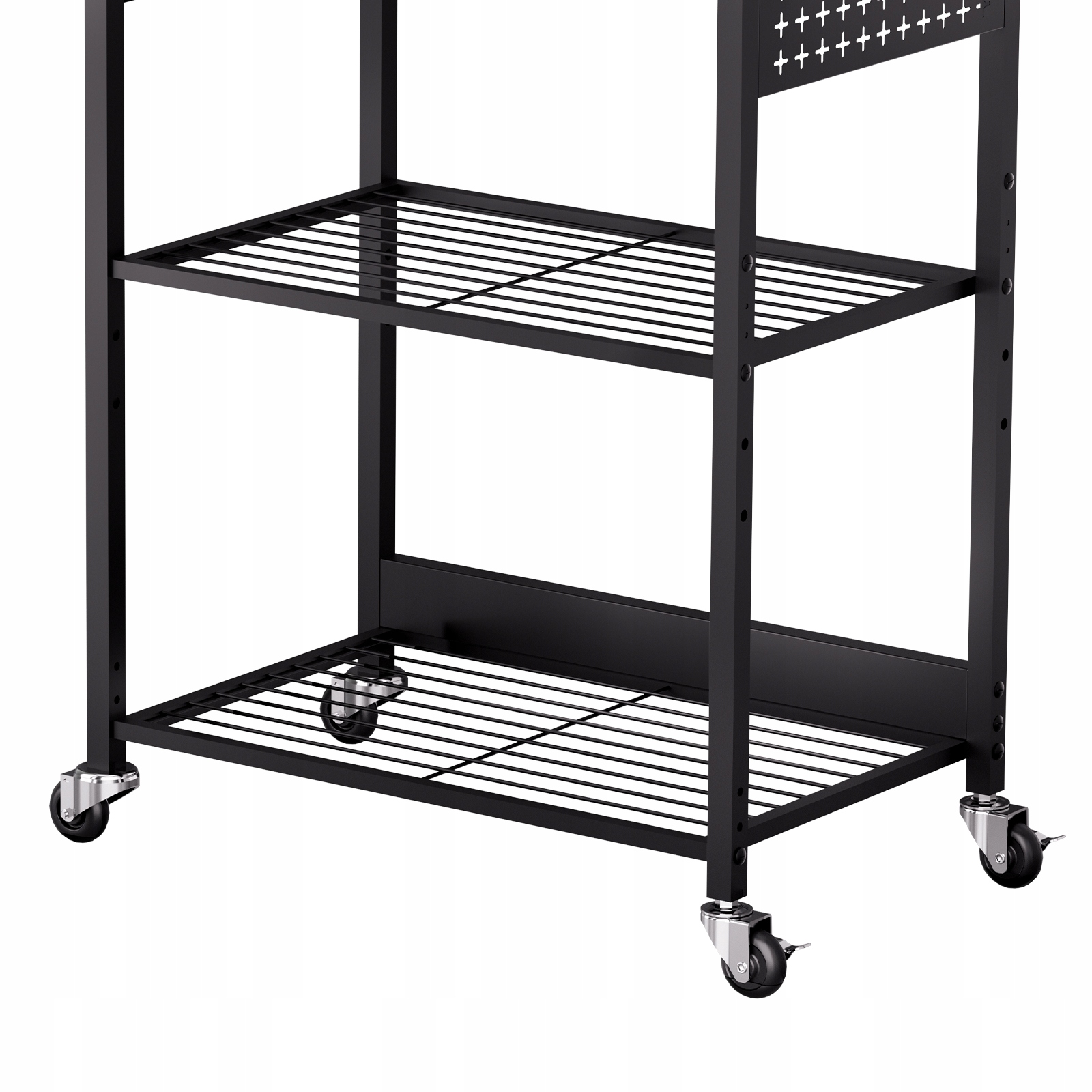 Більше жодного безладу! Візок для інструментів оснащений трьома сітчастими полицями, тримачем для свердла та перфорованими бічними панелями з гачками, тримачем для викрутки та гайкового ключа, що полегшує організацію. Завдяки чотирьом поворотним колесам (два з яких замикаються) і вантажопідйомністю 68 кг він ідеально підходить для майстерень, гаражів і відкритих майданчиків. Ваш ідеальний компаньйон по роботі! Гнучкий і адаптований