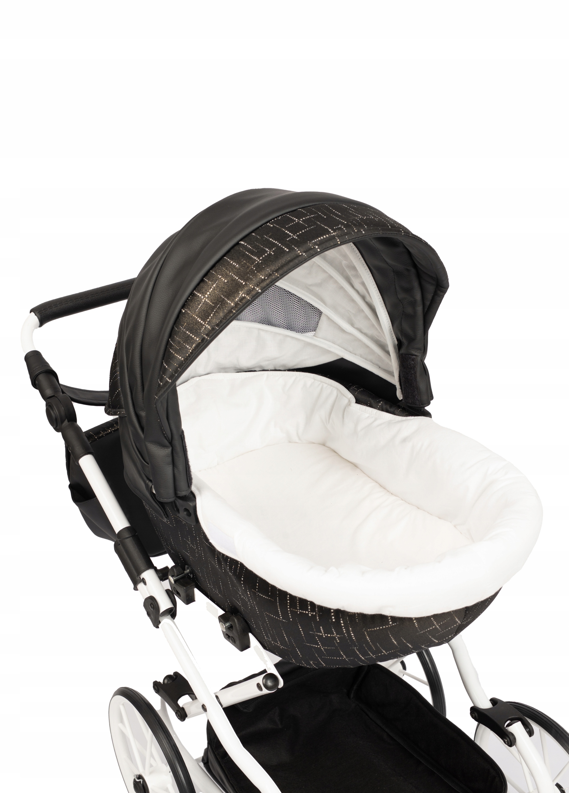 Оббивка коляски — це м’яка екошкіра на 90% і поліестер на 10%, виготовлена з особливою ретельністю та увагою до деталей.
