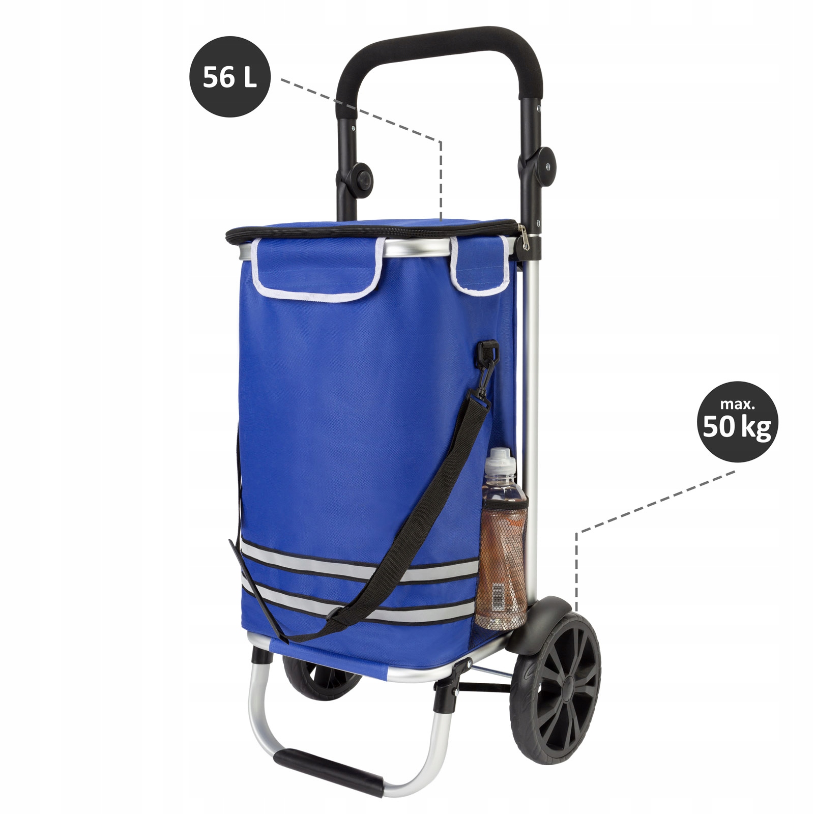 Візок для покупок має місткість 56 літрів і максимальне навантаження до 50 кг.