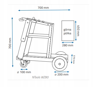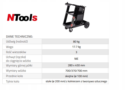 Трьохполичний візок для транспортування зварювального обладнання та споттерів. Виготовлений із сталевого листа товщиною 2 мм, покритого структурним покриттям, яке запобігає появі подряпин і забезпечує стійкість і високу вантажопідйомність до 80 кг. У колясці є місце для газового балона. Верхня полиця розміщена під кутом, щоб оператор пристрою мав зручний доступ до панелі управління. Нижня полиця призначена для зберігання всіх зварювальних приладдя, таких як трикутники, заклепки, зварювальний дріт.