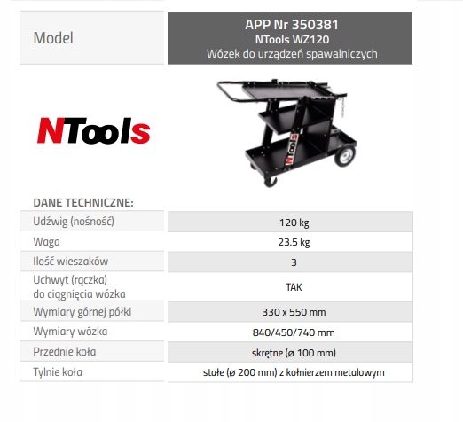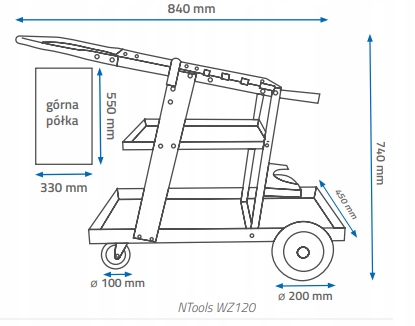 трьох коштів для транспортування. Він виготовлений з сталевого листа товщиною 2 мм, покритого конструкційним покриттям, що запобігає подряпинам і забезпечує стабільність та високу здатність до 120 кг. У колясці є місце для газового циліндра. Верхня полиця була розміщена під кутом, щоб оператор пристрою мав зручний доступ до панелі управління. Нижня полиця призначена для зберігання всіх зварювальних аксесуарів, таких як трикутники, заклепки, зварювальні дроти.