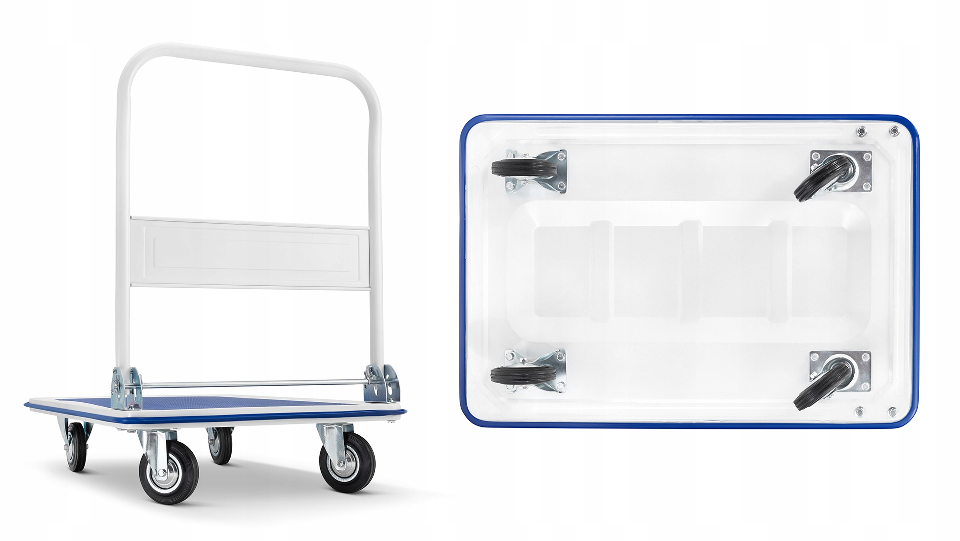 Завдяки таким розмірам візки можна використовувати на складах, в магазинах, майстернях і скрізь, де необхідно транспортувати вантажі. Платформа виготовлена з профільованого сталевого листа з додатковим тисненням для збільшення жорсткості. Порошкове покриття забезпечує високу стійкість до подряпин, відколів та іржі. Поверхня покрита протиковзким матеріалом синього кольору, який запобігає переміщенню вантажу під час транспортування. Матеріал постійно прикріплений до платформи.
