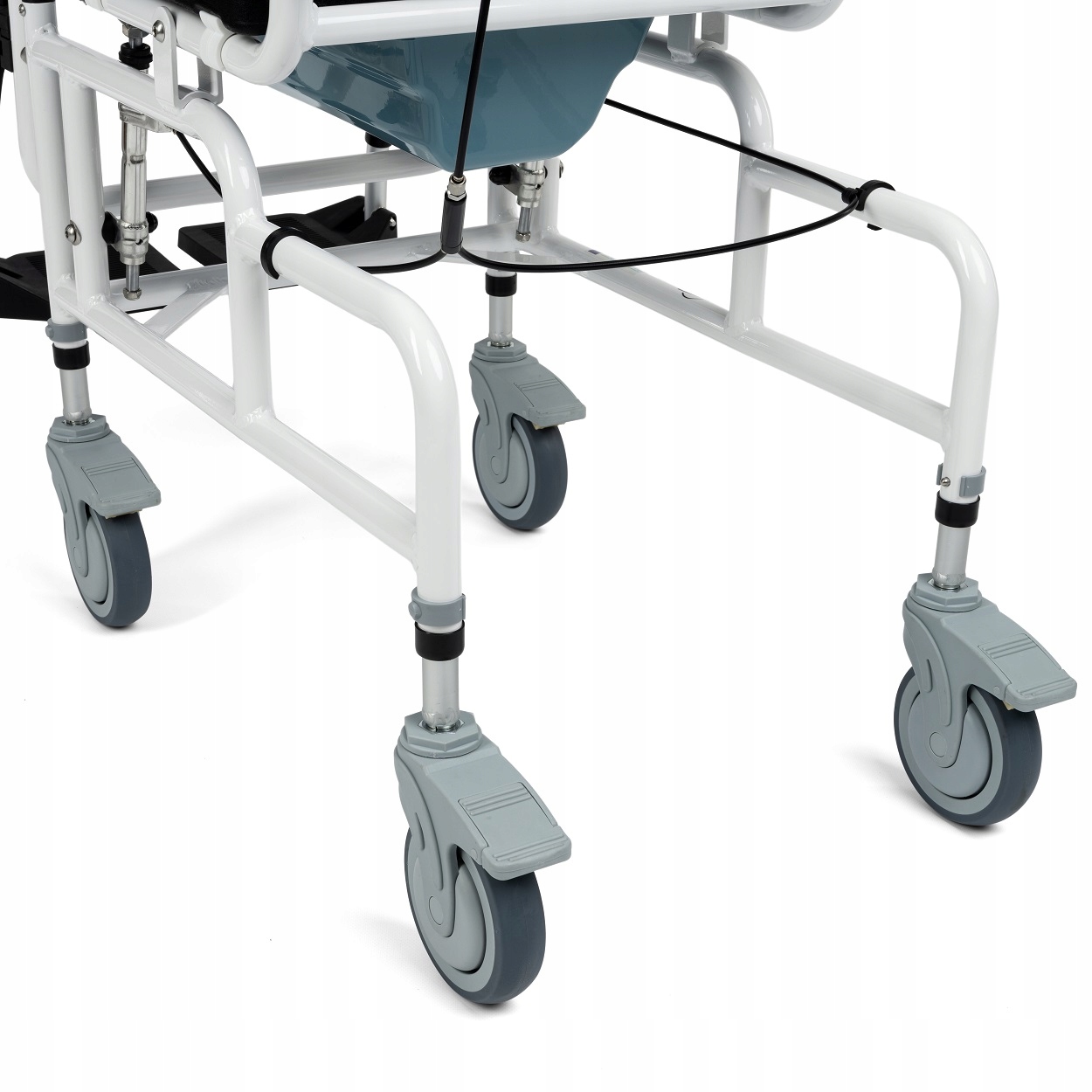 Візок для транспортування душу та туалету MASTER-TIM PLUS - Візок для транспортування душу та туалету є допоміжним пристроєм для людей, які мають проблеми з самостійним пересуванням, і для людей з обмеженими можливостями та руховими обмеженнями. Призначений для використання всередині приміщень. Управляти нею можна лише з супроводжуючою особою.