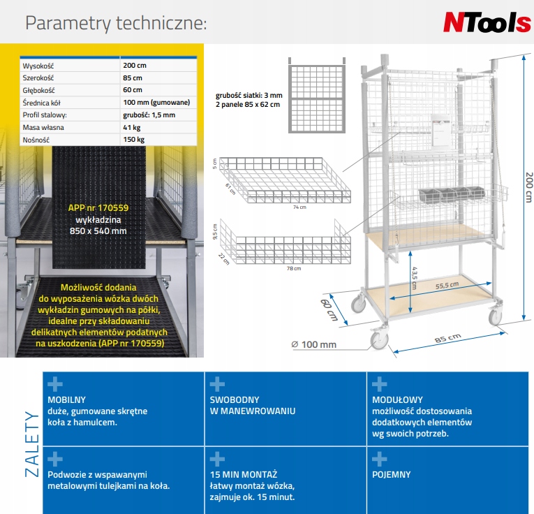 Візок допоміжний для кузовних частин | 41 кг | 850x 600x2000 мм | NTools