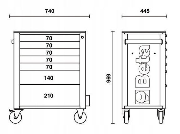 7 висувних ящиків (588x367 мм), з кульковими напрямними: 5 ящиків, висота 70 мм; 1 ящик висотою 140 мм; 1 ящик, висота 210 мм