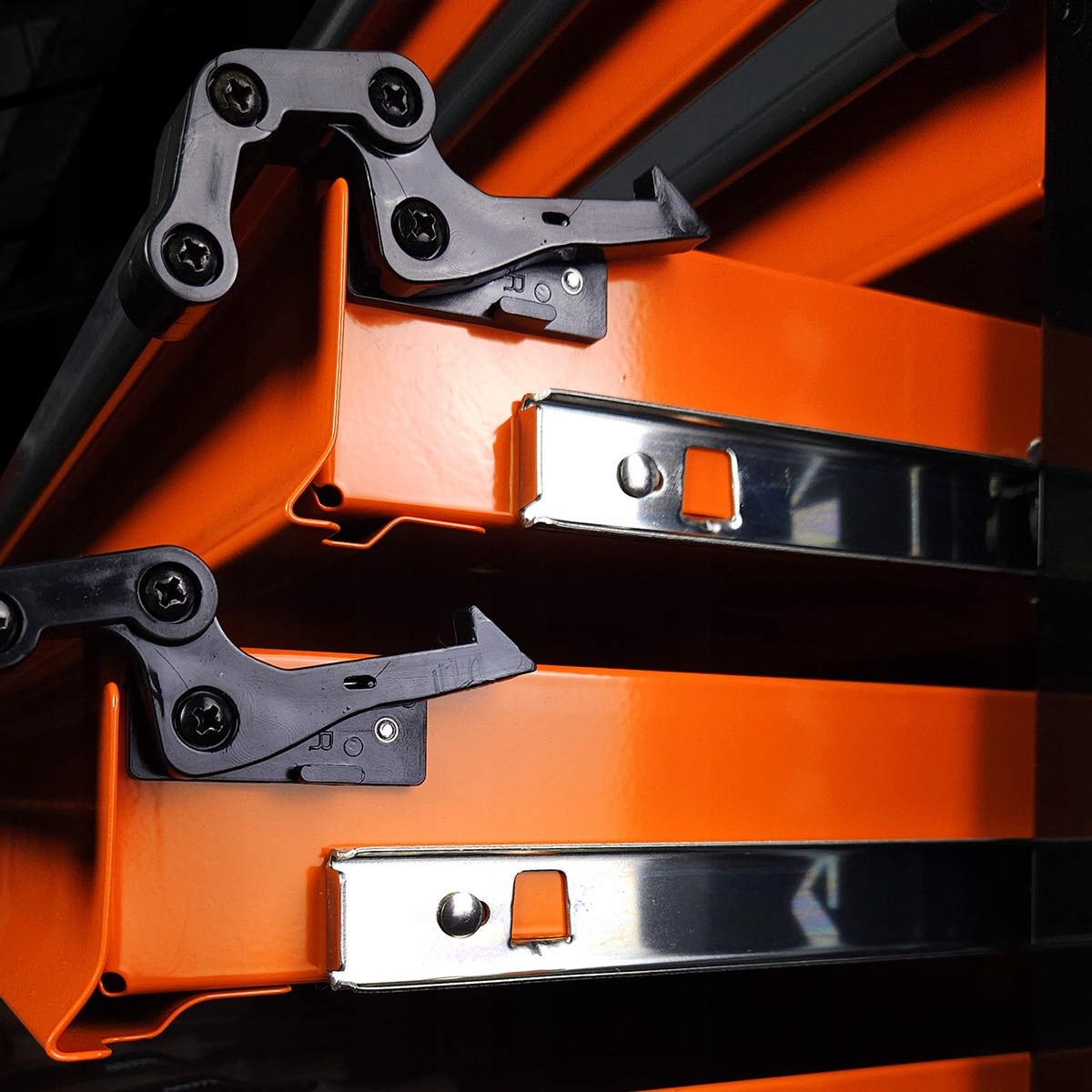 Завдяки інтегрованому замку всі 7 ящиків можна заблокувати одночасно, що запобігає їх випадковому відкриттю при переміщенні шафи. Суцільна сталева робоча стійка дозволяє зручно відкласти часто використовувані інструменти. Будівництво з подвійними стінами, арматура тіла та кульові путівники забезпечують гладкі та тривалі ящики.