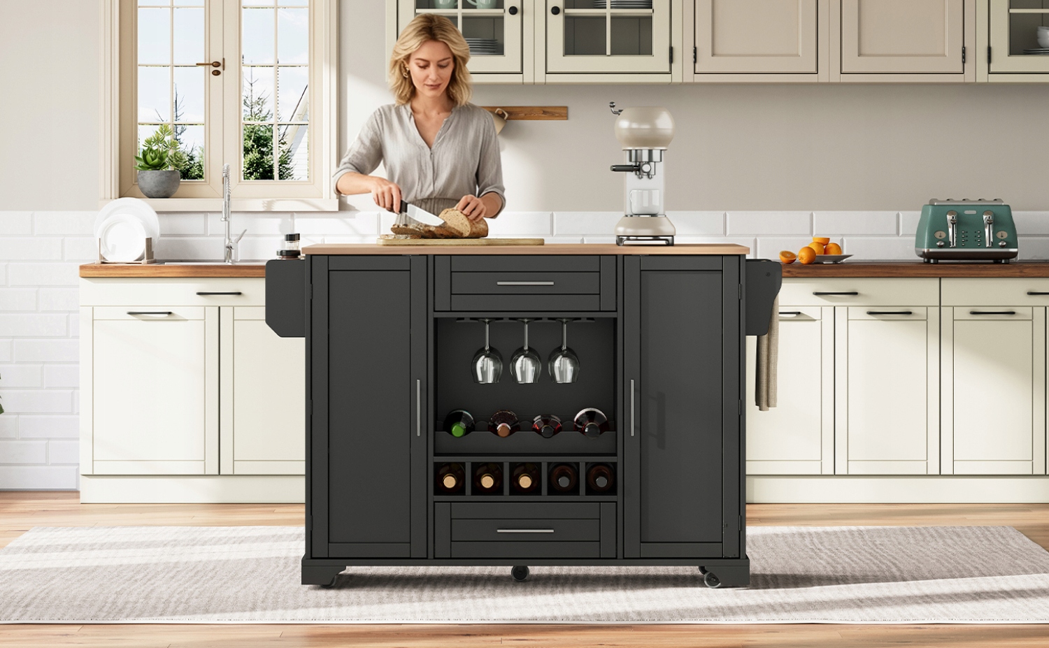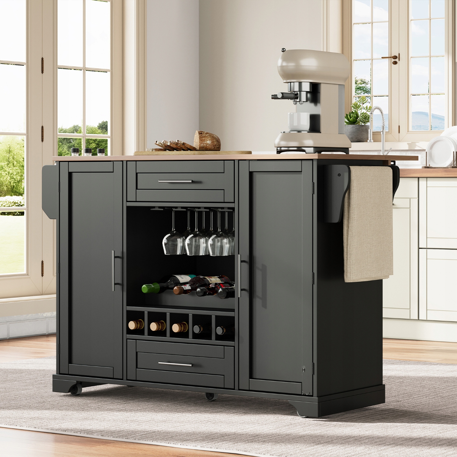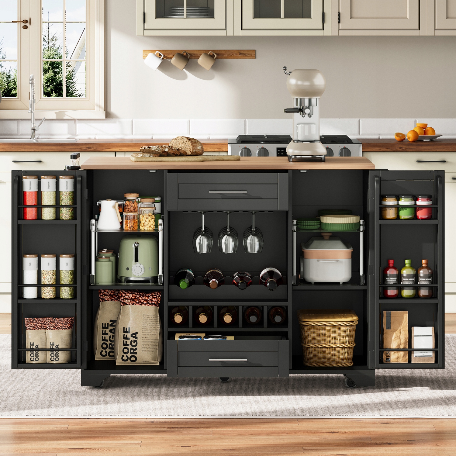 - Дві тихі шухляди забезпечують додатковий простір для зберігання посуду та кухонного приладдя. Міцна дерев’яна вішалка для рушників і підставка для спецій збоку спрощують приготування їжі та допомагають підтримувати порядок і порядок на вашій кухні.