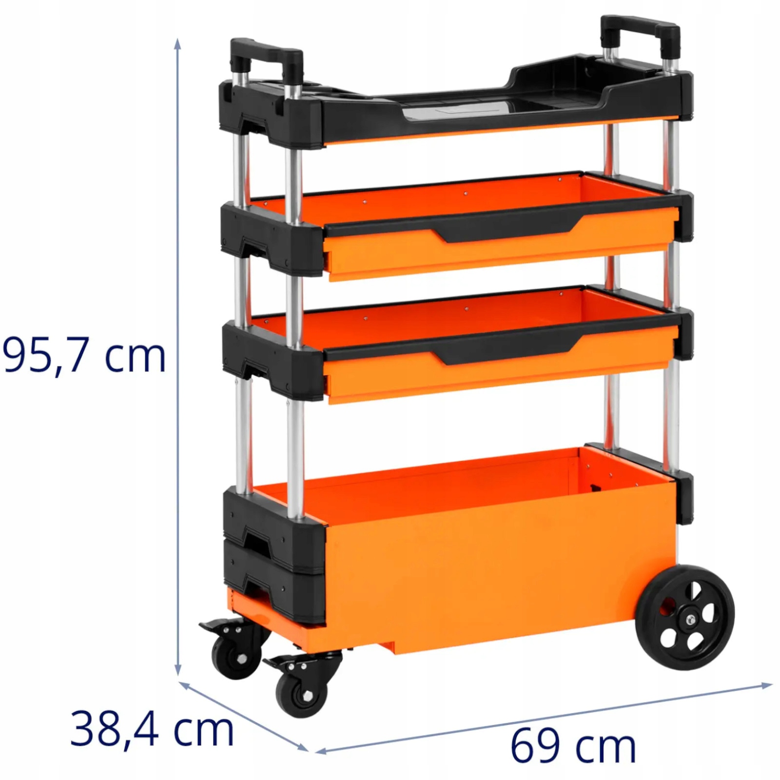 Візок для майстерні ТПВ пропонує багато місця для підготовки інструментів або матеріалів і дозволяє легко переміщати їх туди, куди вони потрібні. Добре продумана система ящиків забезпечує гнучкий доступ до предметів. Все необхідне завжди під рукою. Стабільна структура забезпечує багато місця для зберігання на чотирьох поверхах. Велике відділення пропонує додатковий простір. Висота двох ящиків визначається відповідно до ваших потреб. У верхній частині є практична поличка. Полиці і відділення виготовлені з міцного пластику і призначені для роботи в складних умовах, таких як цехи або актові зали. Міцний матеріал також витримує великі навантаження. Гладкі поверхні візка для майстерні легко миються. Чотири колеса дозволяють ефективно пересувати коляску. Дві фіксовані, дві поворотні і мають гальма. Це не тільки забезпечує високу мобільність, але й безпечно утримує візок на робочому місці. Велика ручка забезпечує неперевершену маневреність.