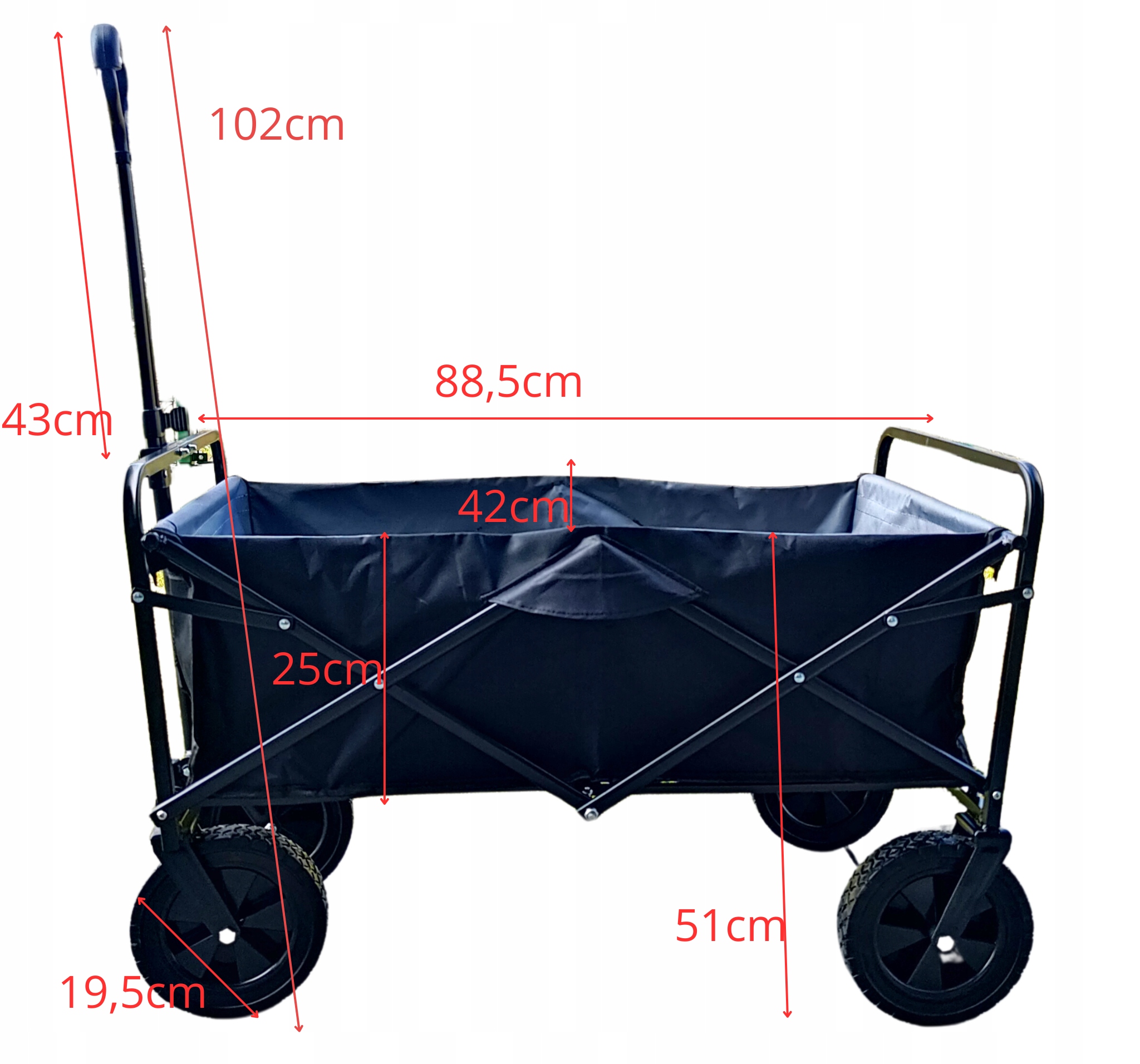 Розміри в складеному вигляді: Довжина 88 см, висота без ручки 52 см, ширина 52 см
