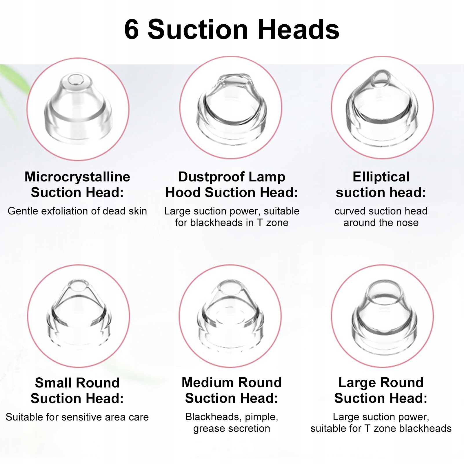 3. 6 всмоктувальних голів: Завдяки 6 всмоктувальних головках різні головки мають різні функції, тому ви можете легко вибрати правильні головки для різних областей шкіри, придатні для базового догляду за обличчям.