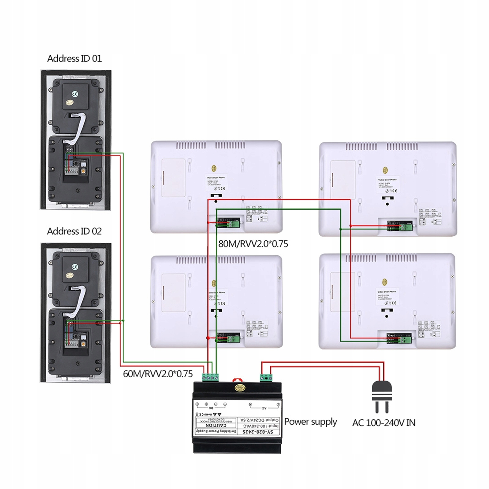 1. Для 2-провідної системи потрібні лише дві лінії: живлення, аудіо, відео та керування, які передаються через 2-провідне неполярне центральне джерело живлення. Відкрийте 2 замки одночасно.