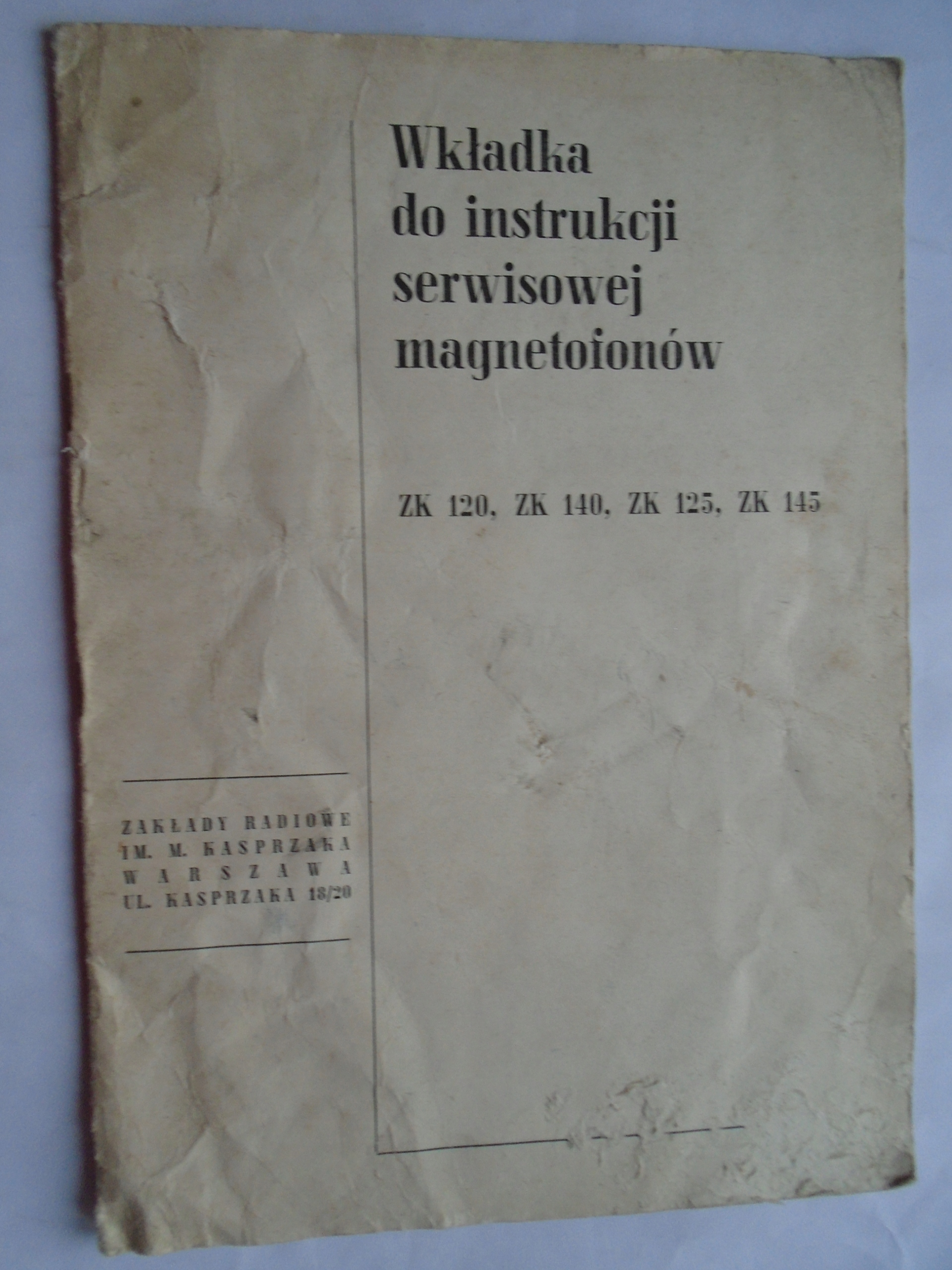 Вкладиш ДО СЕРВІСНОГО ІНСТРУКЦІЇ ДЛЯ МАГНІТОФОНІВ ZK 120 ZK 145 ZAŁADY KASPRZAKA