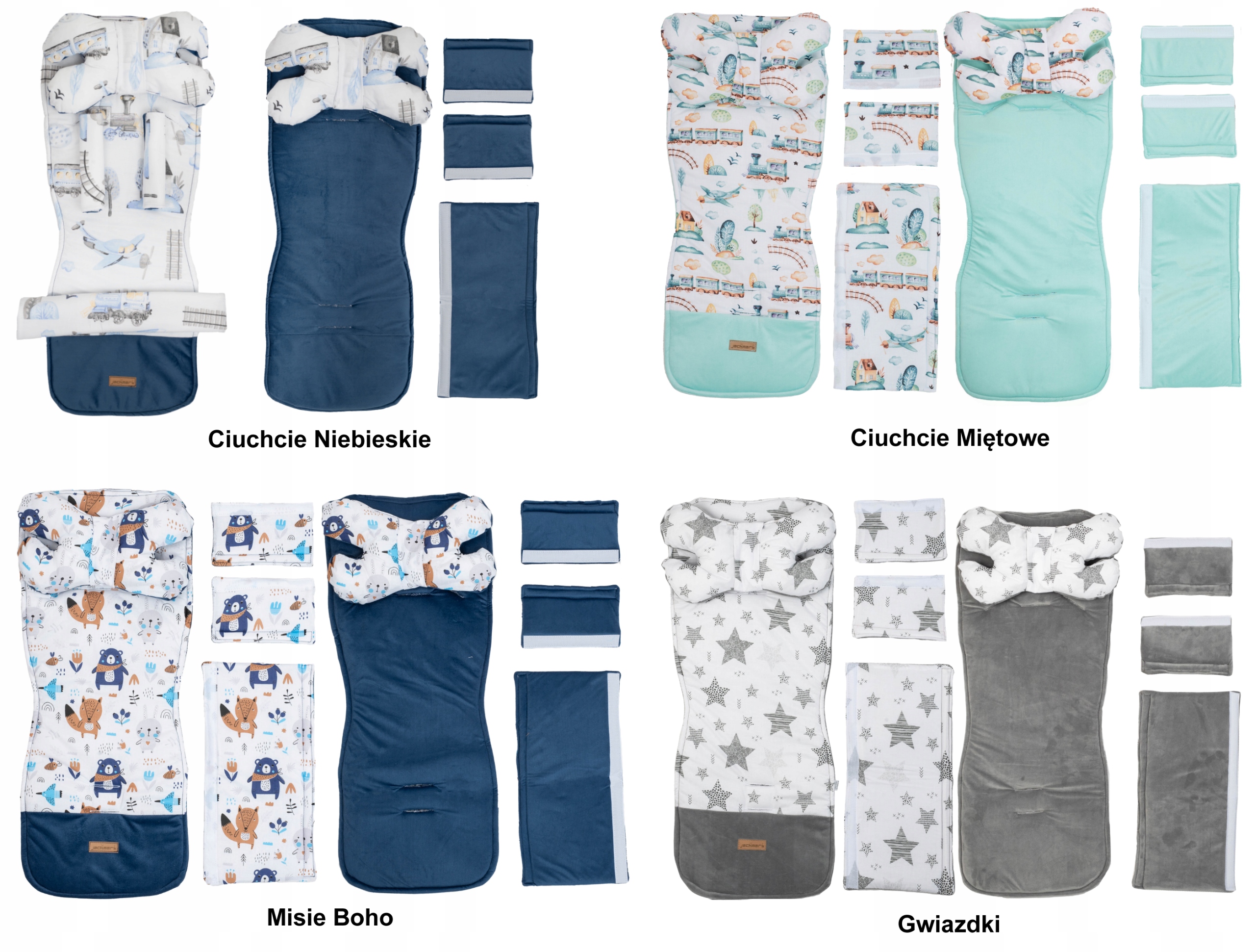 Двостороння вставка для коляски зі 100% бавовни в різних візерунках і кольорах, з іншого боку в поєднанні з оксамитом VELVET OR MINKI, альтернатива для холодних днів. Він наповнений м'якою підкладкою всередині і може використовуватися з обох сторін.