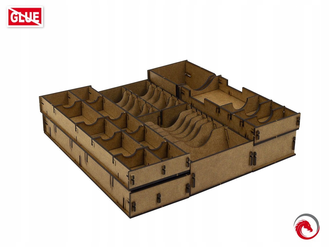 - Вставка має знімні коробки з відділеннями для жетонів або фігурок, які можна легко вийняти зсередини та розмістити в зручному місці біля дошки.