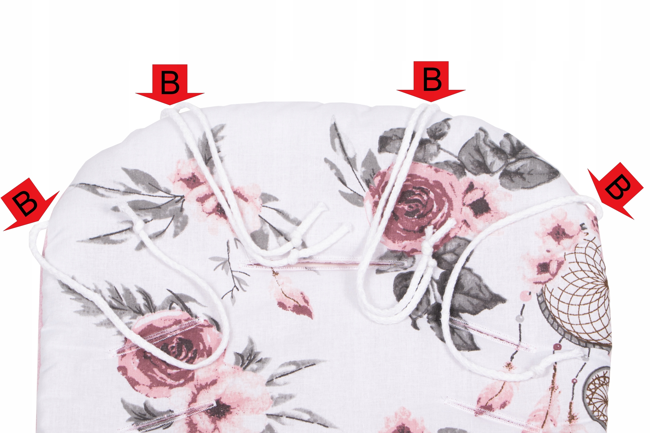 B-Вшиті ремені дозволяють прикріпити вкладиш до спинки коляски, що запобігає вислизанню вкладиша з сидіння.
