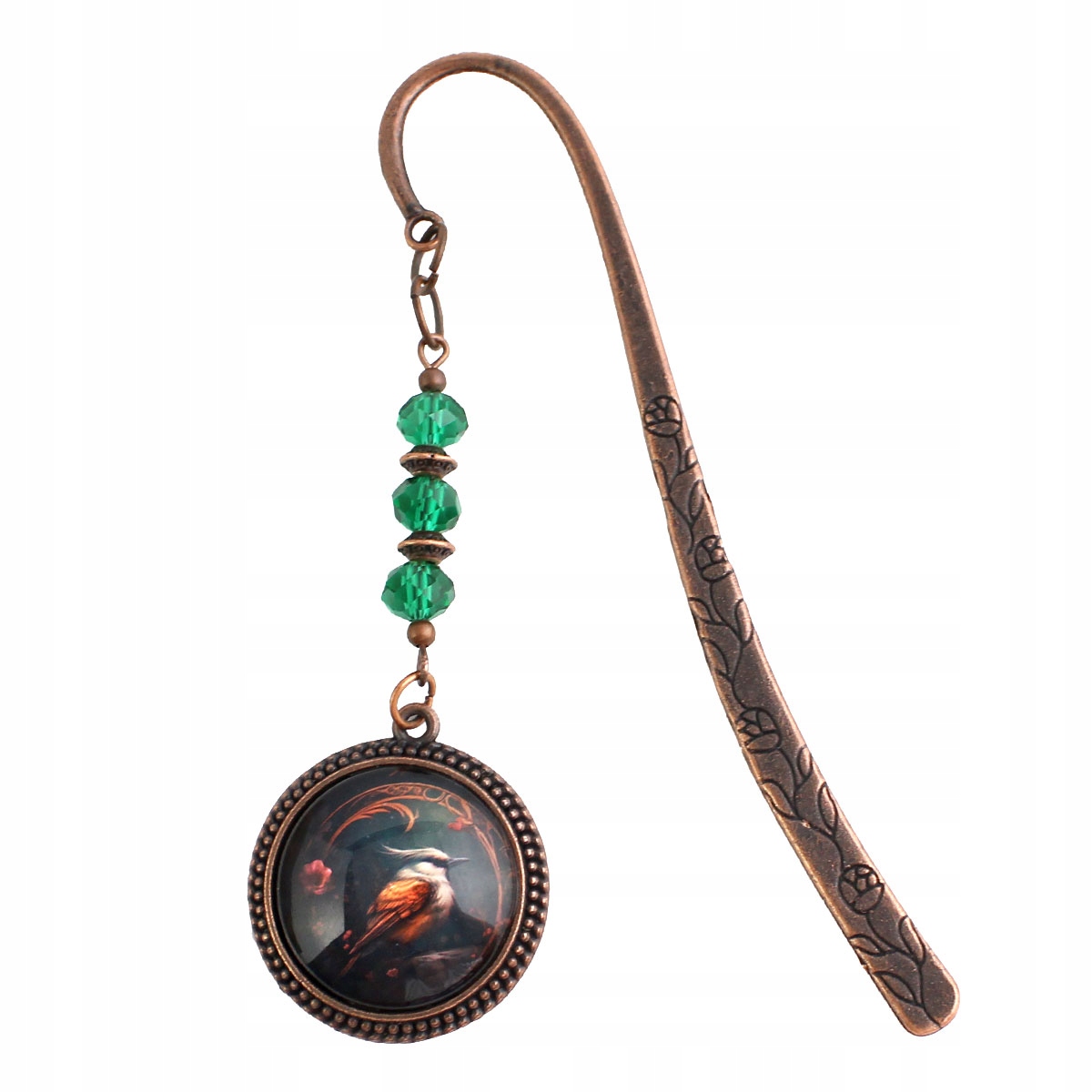 Закладка з ілюстрацією птаха в стилізованій рамці, з мідною обробкою та темно -зеленими кристалами. Муді та елегантний.