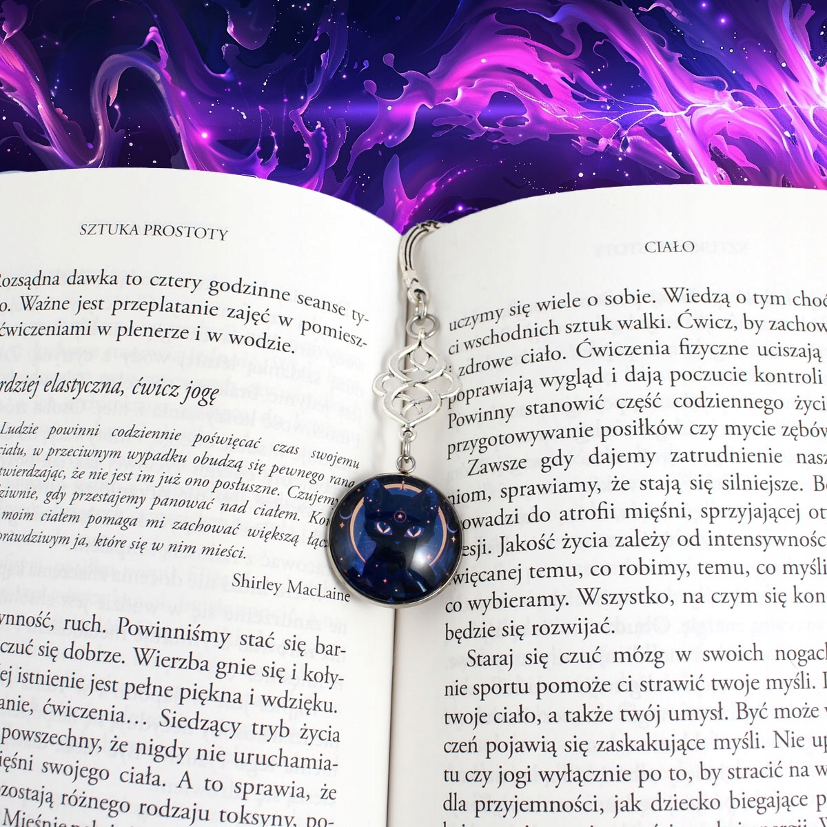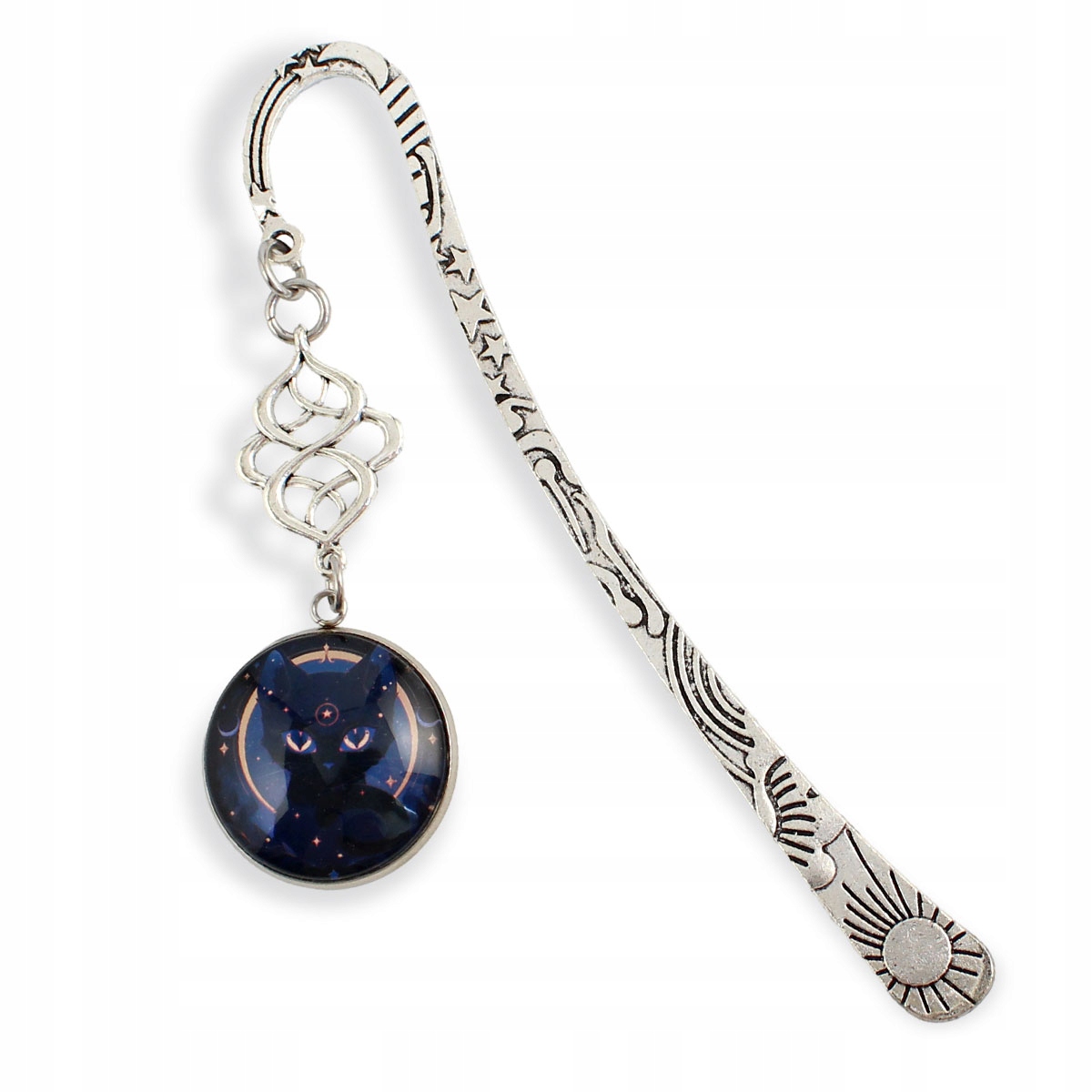 вкладки, виготовленої з елементів у стародавньому сріблі, прикрашеній оригінальною графікою кота, закритою під опуклою слайдом. Ідеально підходить для подарунка або як унікальне доповнення до книги - для ентузіастів магії та загадкових ілюстрацій.