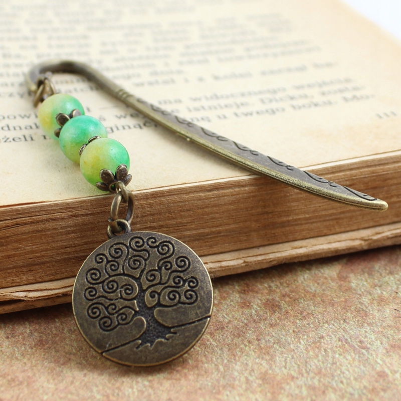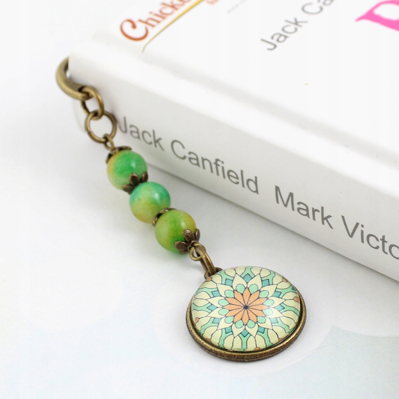 Закладка ручної роботи з камінням - нефритова та графіка, закрита під опуклою слайдом, обрамлена в основі в стародавньому кольорі бронзи. Графіка показує мандали.