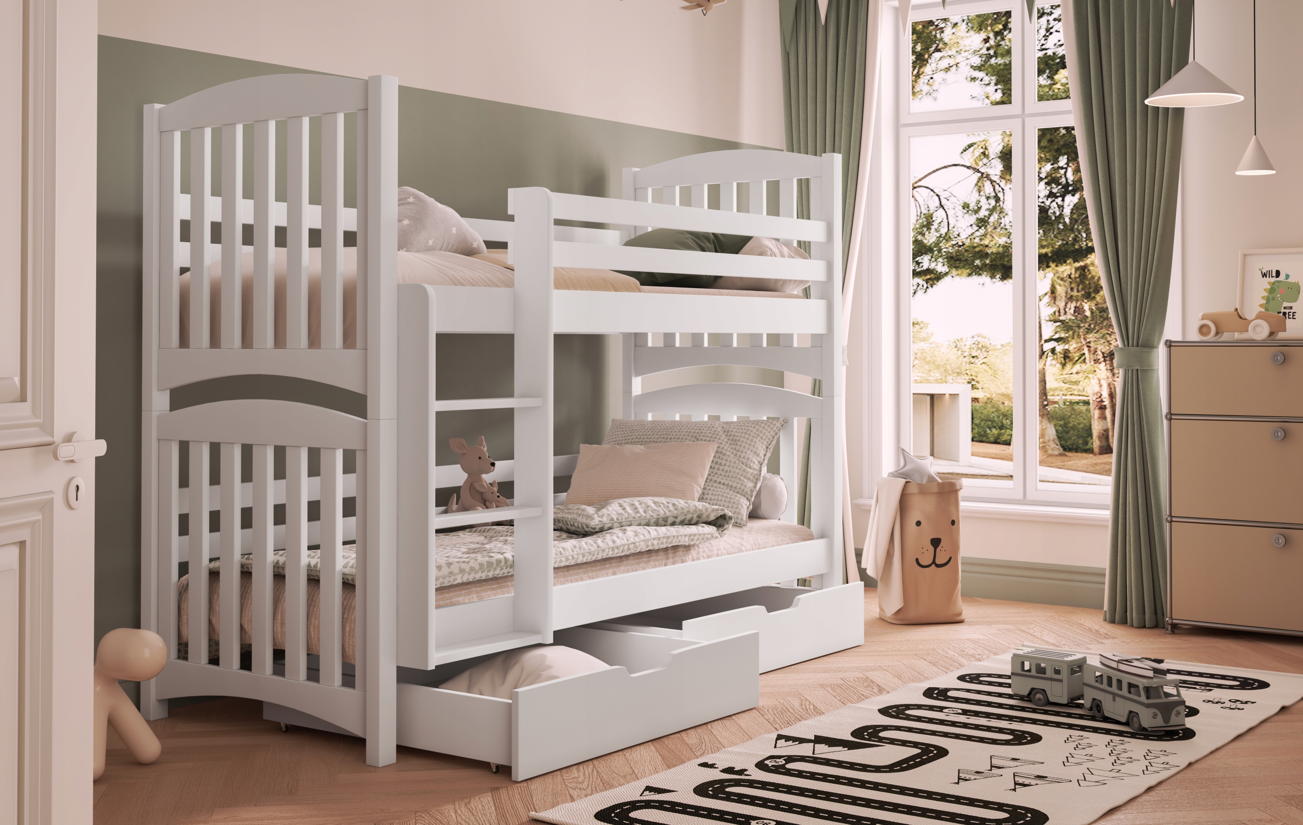 двоярусне ліжко, має два повні ящики для постільної білизни на 4 валиках. Він характеризується високою якістю, силою та відповідає всім стандартам безпеки.