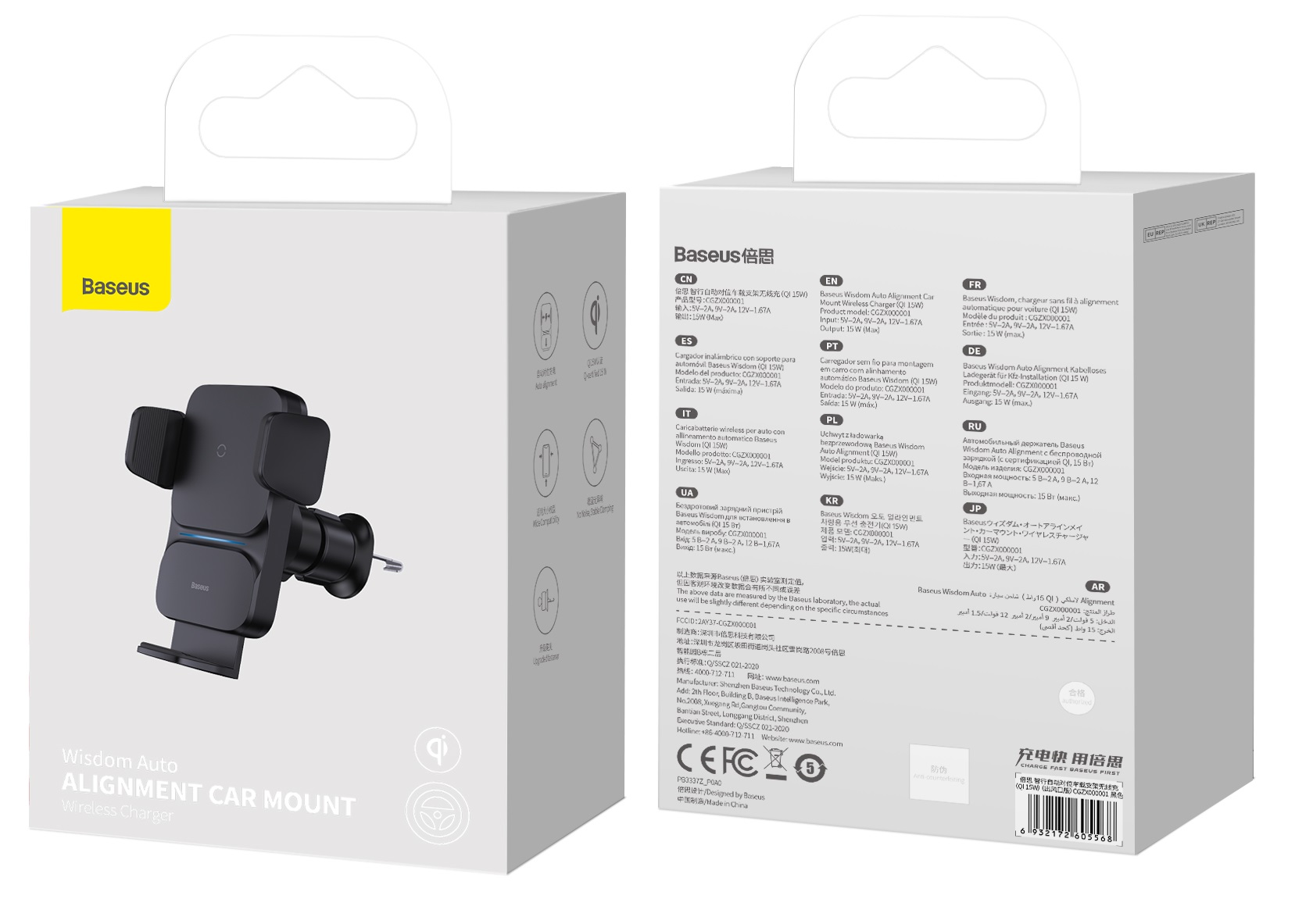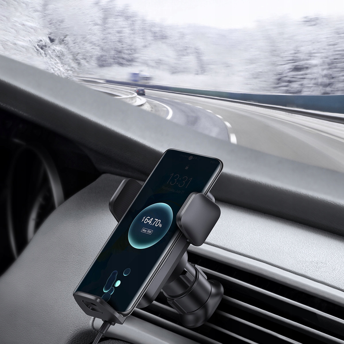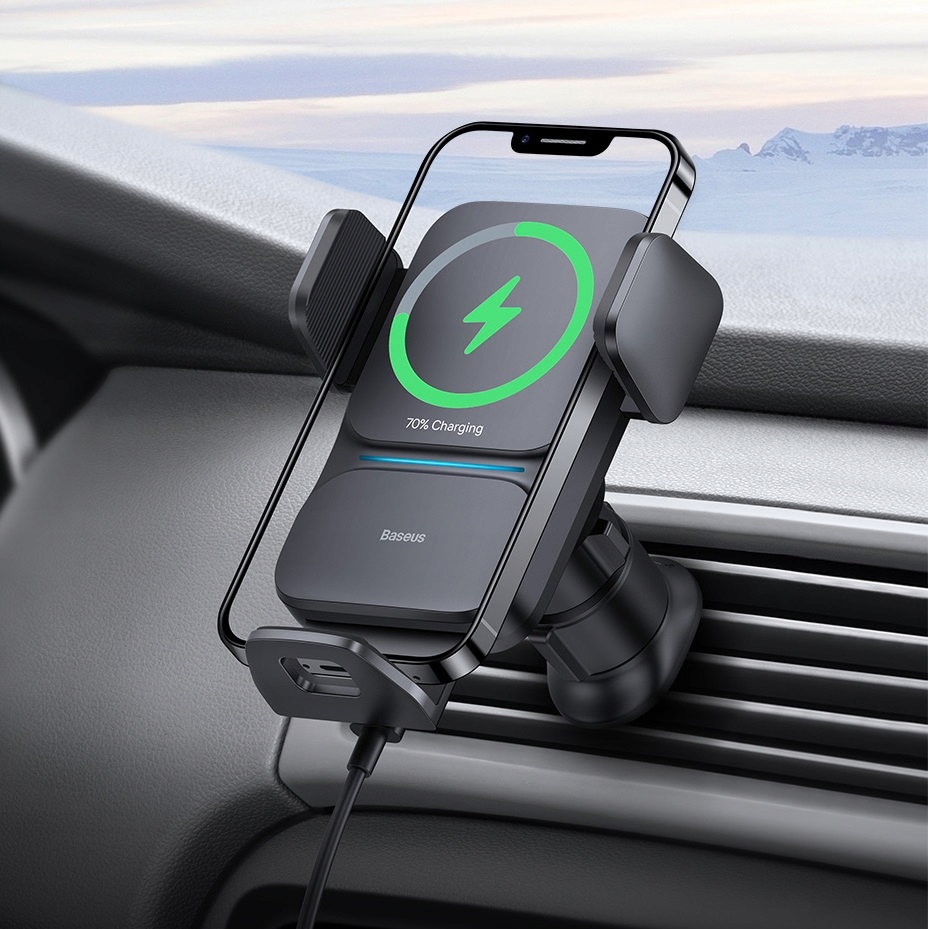 Базуз Мудрості автомобіля Авто -алігмент - це автоматична ручка Grid вентиляція в машині. Він автоматично стискається після вставки телефону. Це можна керувати однією рукою. Додатковою особливістю є вбудований індуктор з високою потужністю 15 Вт.