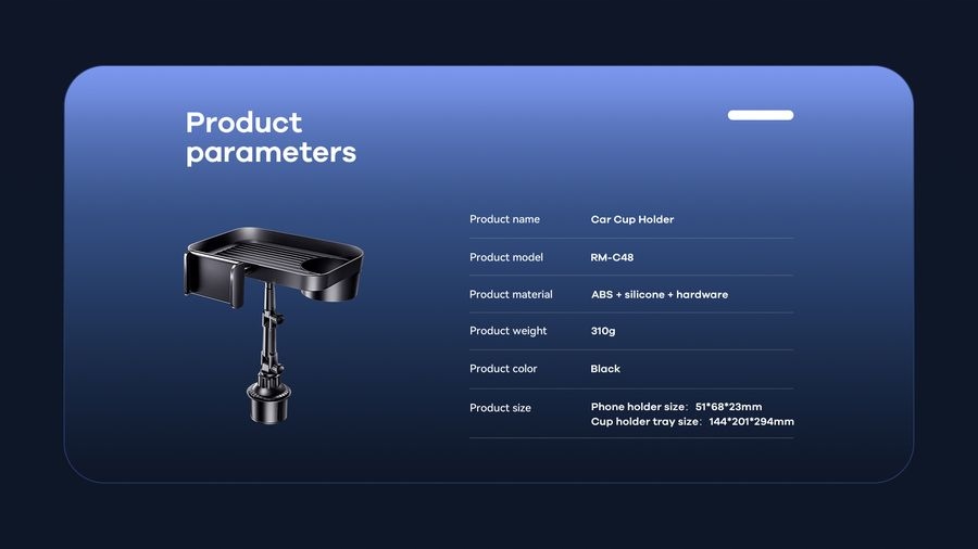 Власник автомобілів RM-C48-це інноваційне та універсальне рішення, яке поєднує функціональність ручки телефону з практичністю напоїв для напоїв та закусок. Цей продукт був створений для людей, які проводять багато часу в машині та потребують комфортного та безпечного простору для своїх пристроїв та аксесуарів.