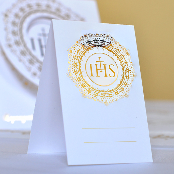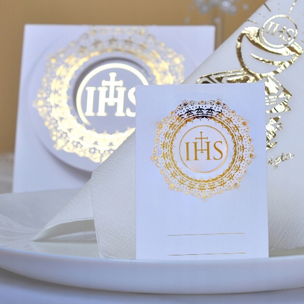 Біла візитниця для причастя з красивим золотим орнаментом. На ньому є відведене місце для написання імені та прізвища запрошеного гостя. Завдяки цим чарівним візитницям кожен знатиме, де сісти. Дуже корисний і практичний елемент декору столу.