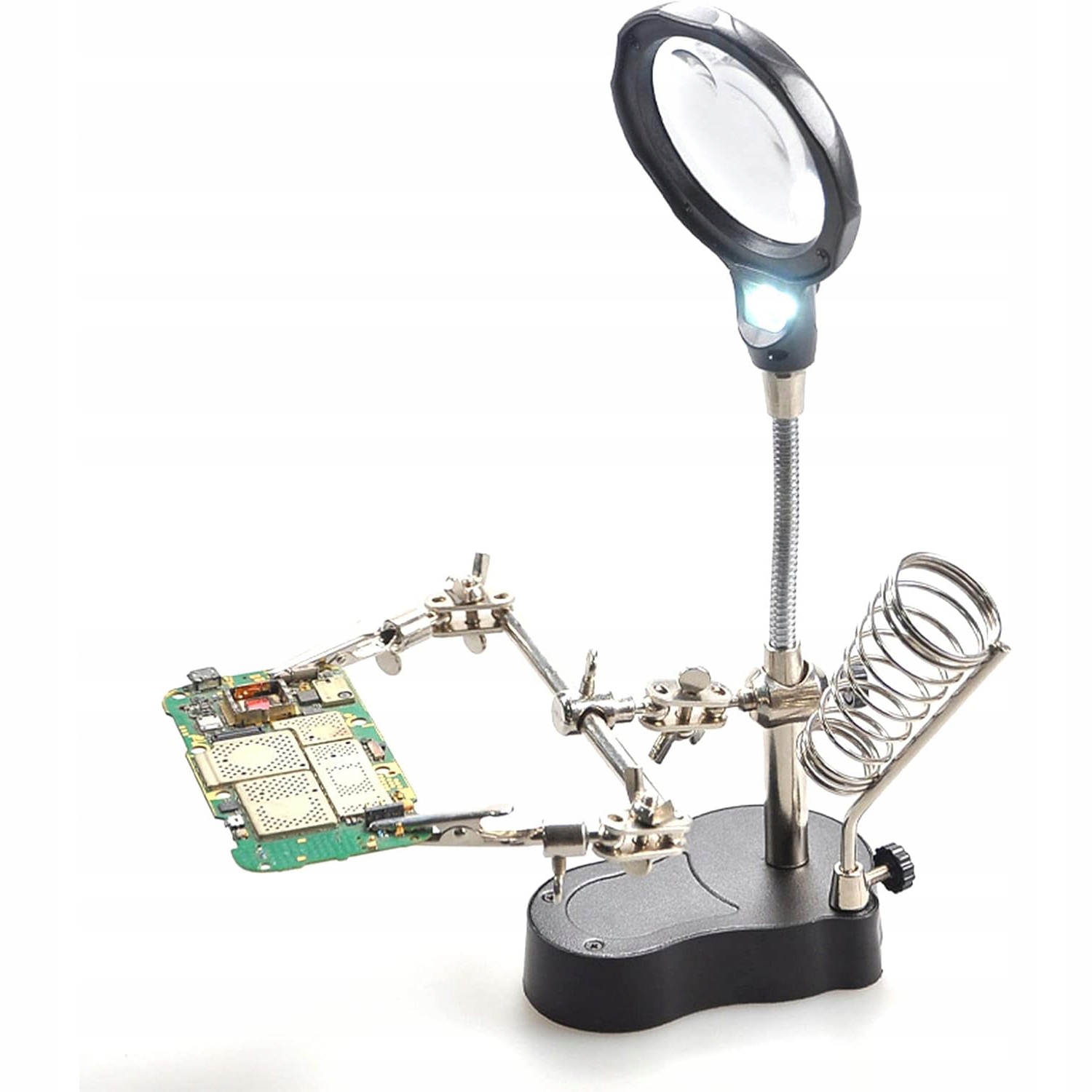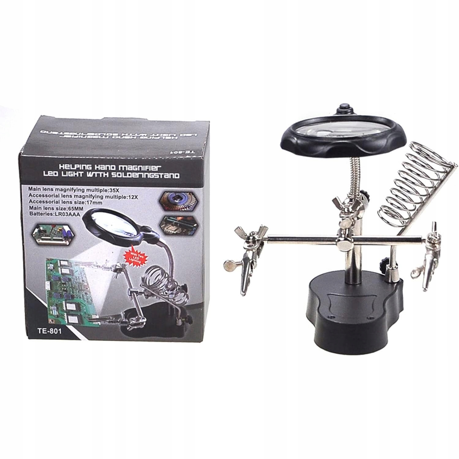 Третя рука з лупиною 3,5x 12x TE-801 | Світло 2х | Регульована крокодила Lutownica Holder Crocodiles Стабільна база 10x6 см висота 26см