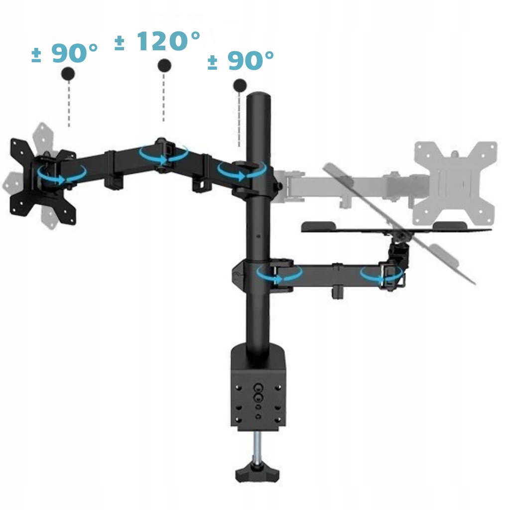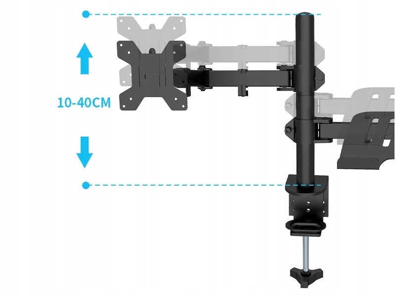 Можливість плавно переміщених плечей уздовж вертикального полюса дозволяє ідеально встановити монітор та ноутбук на відповідній висоті, відповідно до принципів роботи ергономіки. Діапазон руху для максимальної зручності використання.