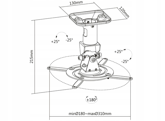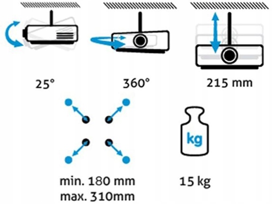 ✅ Universal ceiling holder with a height 215mm from the spider plus Dedicated to multimedia projectors weighing up to 15kg .