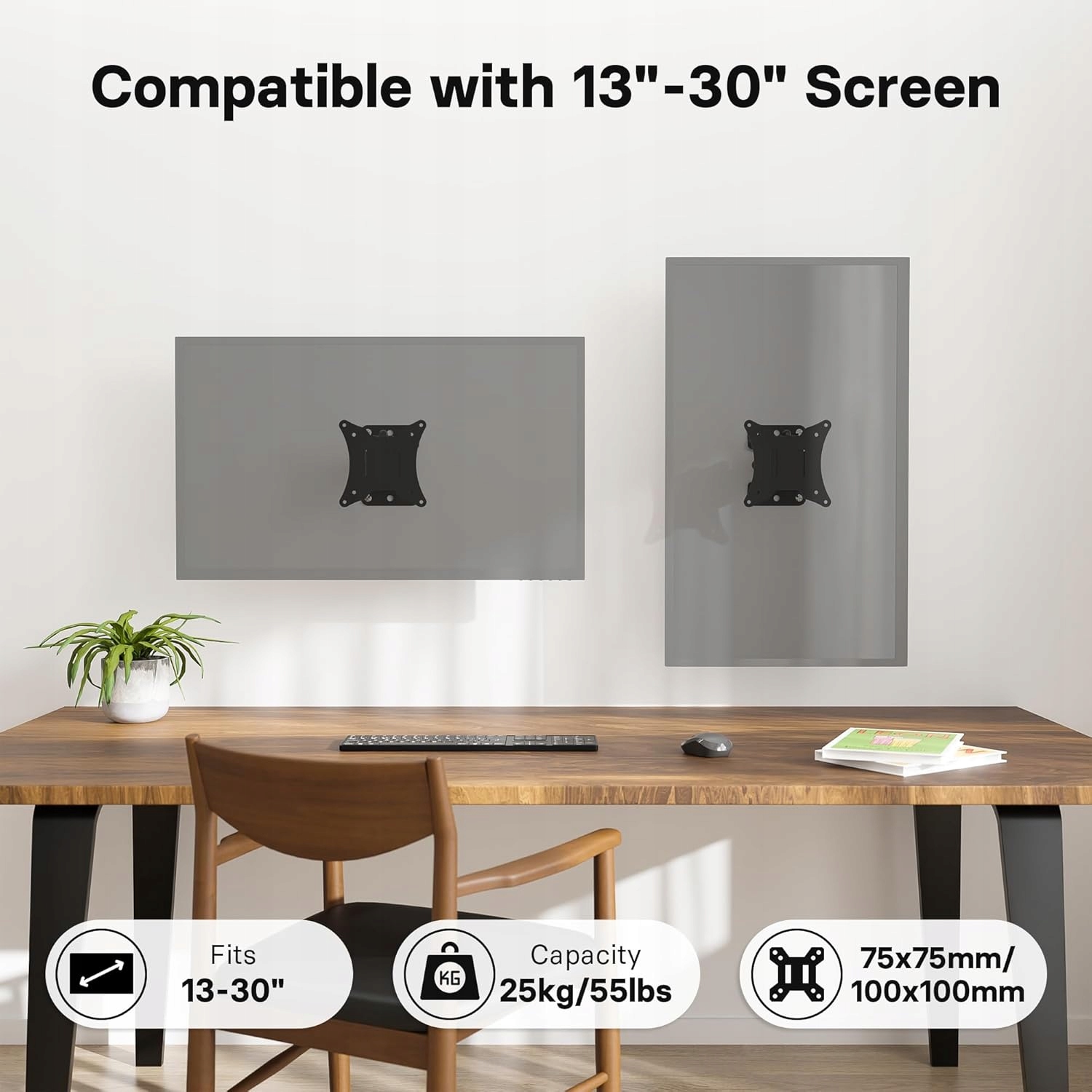 - Стійкий і безпечний дизайн - Міцний настінний кронштейн для телевізора, виготовлений із високоякісної холоднокатаної сталі, витримує екрани вагою до 25 кг; сумісний із VESA 75 x 75 мм і 100 x 100 мм, забезпечуючи надійність і довговічність протягом багатьох років.
