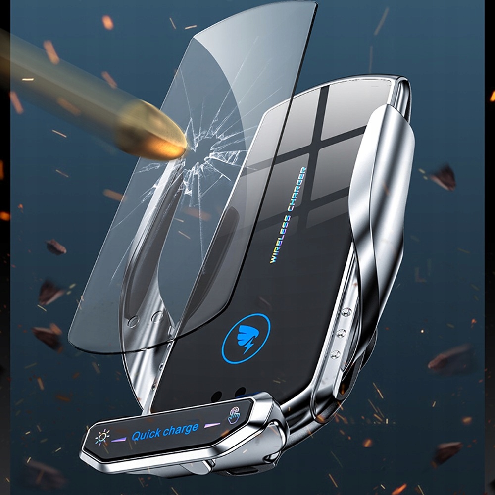 Ця інтелектуальна ручка автомобіля може просто засунути телефон у власник телефону. Коли телефон буде скинутий у кабельне з'єднання, зарядний пристрій для бездротового автомобіля автоматично затягнеться. Торкніться нижнього правого кута, щоб відкрити і закрити руку, торкніться лівої, щоб увімкнути синє середовище.