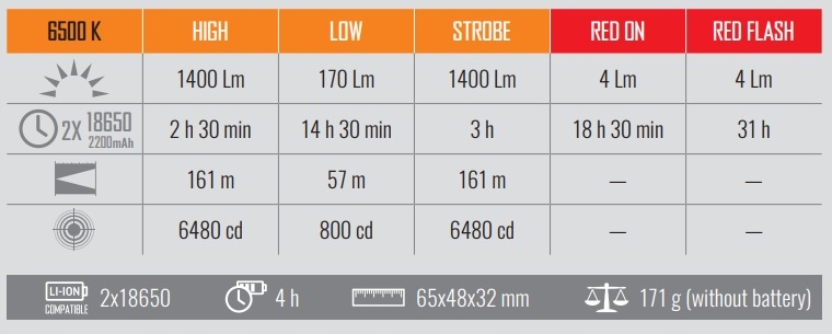 - високий (режим білого світла з максимальною потужністю) - яскравість світла 1400lm. Відстань освітлення - 161 м. Робочий час 2 години 30 хвилин. Інтенсивність світла 6480CD. Відстань освітлення - 57 м. Робочий час 14 годин 30 хвилин. Інтенсивність світла 800cd. - Червоне світло максимальної потужності. Банк " і використовується для стягнення будь -яких мобільних пристроїв.