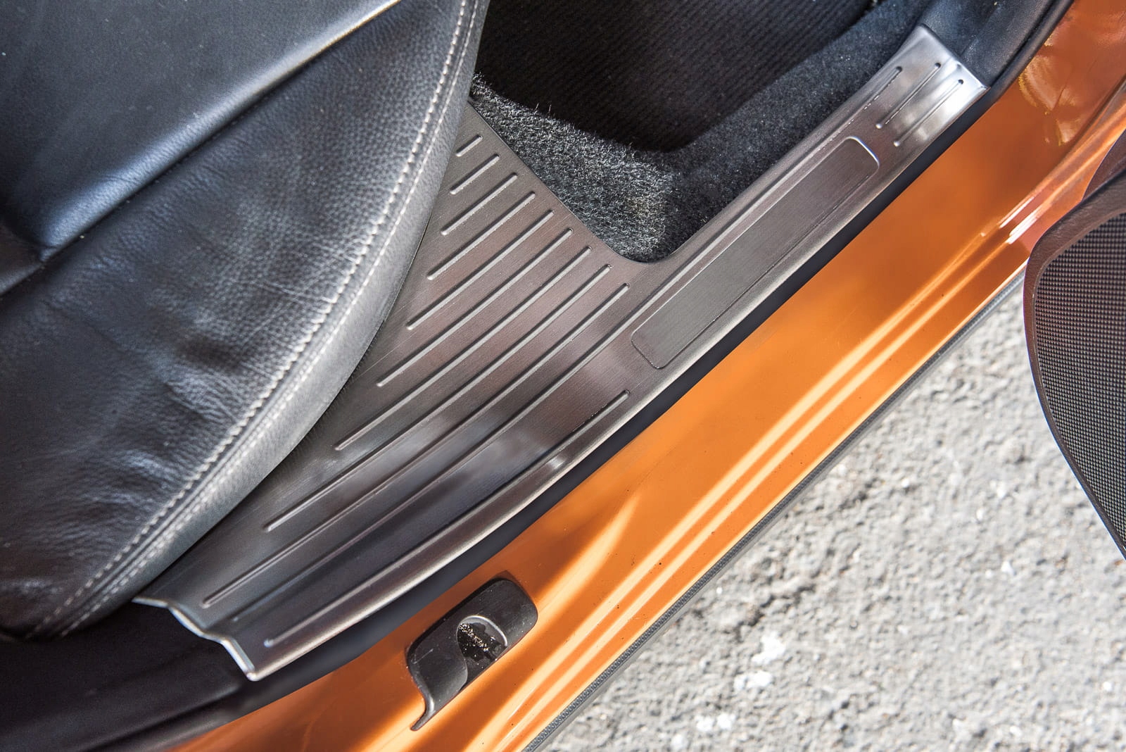 Накладки кріпляться на верхніх пластикових частинах внутрішніх порогів. Вони доповнюють внутрішню лінію дверей і надають поріжку спортивно-елегантний вигляд. На додаток до стильної цінності, смужки виконують захисну роль, захищаючи пороги від подряпин і пошкоджень, які можуть виникнути під час посадки та виходу з автомобіля.