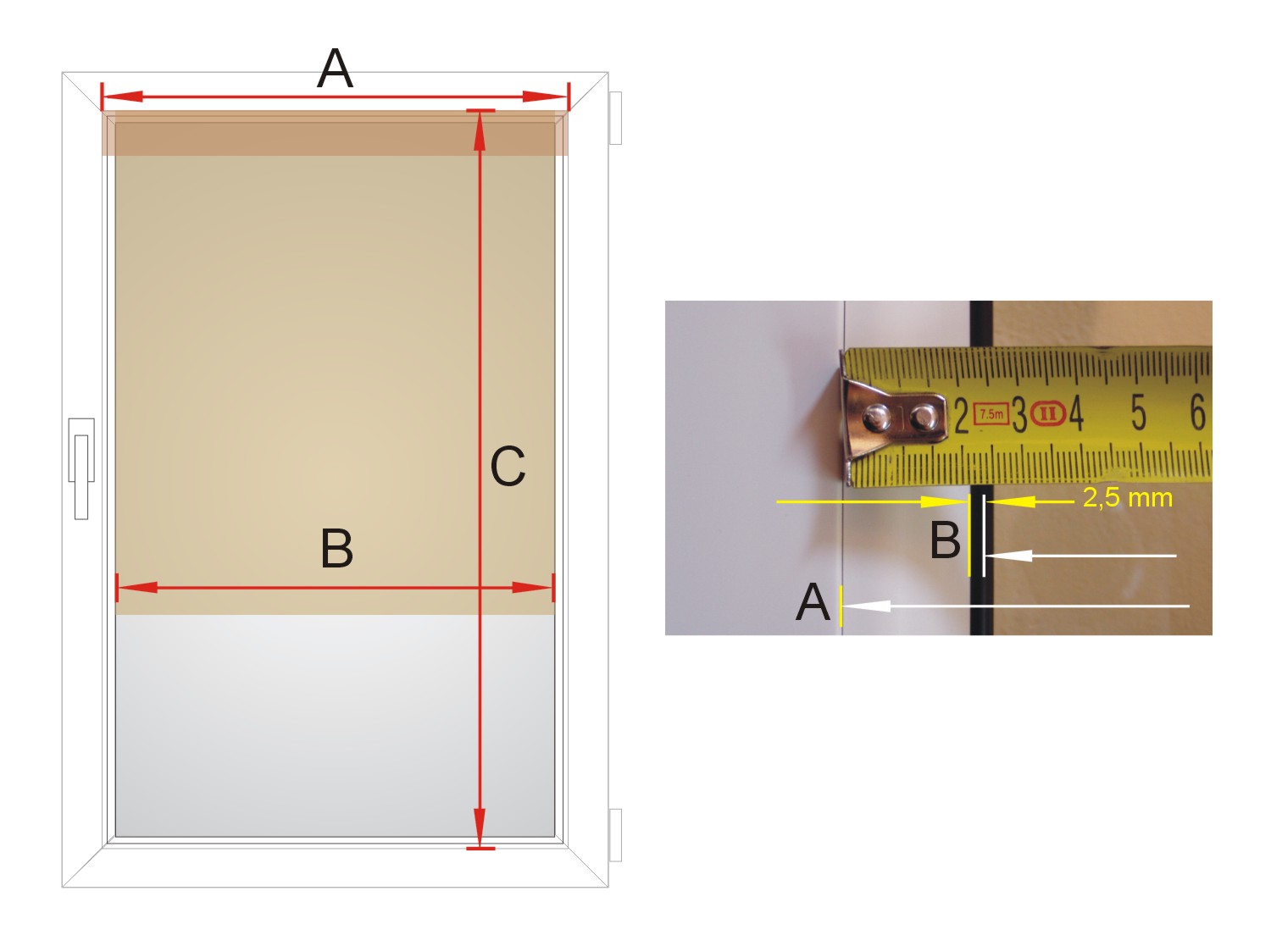 A: ширина корпусу, тобто ширина скла + обидва цілих штапиків, включаючи їхню плоску частину (місце вимірювання - стик) штапика з віконною рамою, ця ширина і буде рамою ролет)