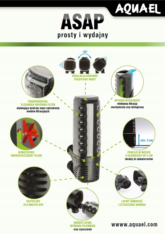 Зараз для більшості з нас найбільш дефіцитним товаром є час. Тому ми робимо все, щоб заощадити якомога більше грошей і для цього шукаємо по можливості прості та зручні рішення в кожній сфері життя. Це стосується і акваріумістики, тому AQUAEL представляє абсолютно нові, революційні внутрішні акваріумні фільтри серії ASAP. Вони поєднують у собі дуже високу ефективність роботи та численні корисні властивості з виключно простою конструкцією, яка скорочує час, необхідний для роботи пристрою, до мінімуму.