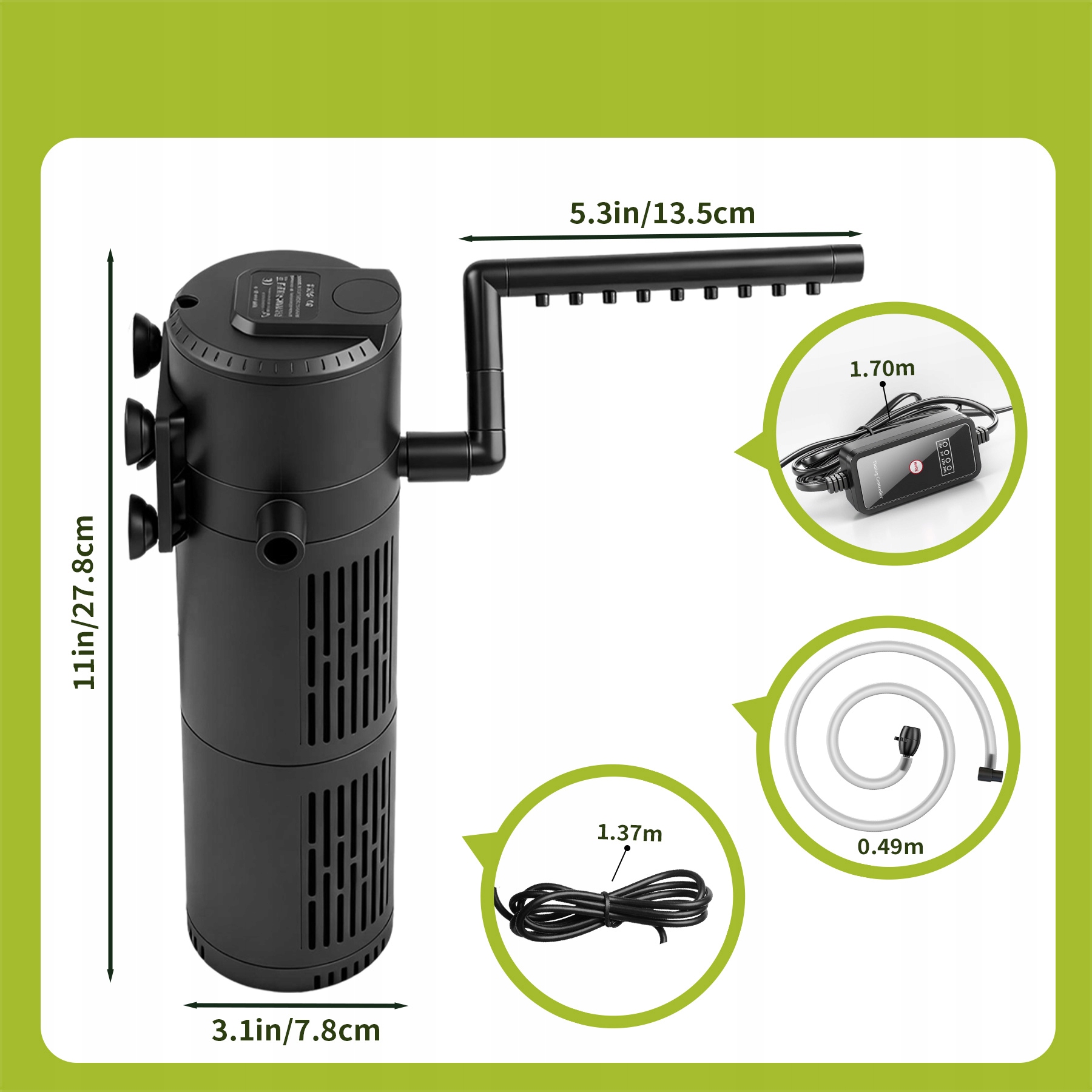 Цей акваріумний фільтр — ефективний акваріумний фільтр із функцією УФ — поєднує в собі переваги внутрішнього насоса та акваріумного насоса з фільтром і вбудованим УФ-очисником акваріума. Знищує мікроорганізми, пригнічує ріст водоростей/моху та бореться з вірусами, має таймер із 4 часовими режимами (4H/8H/12H/24H) і може бути відключений, коли не використовується.