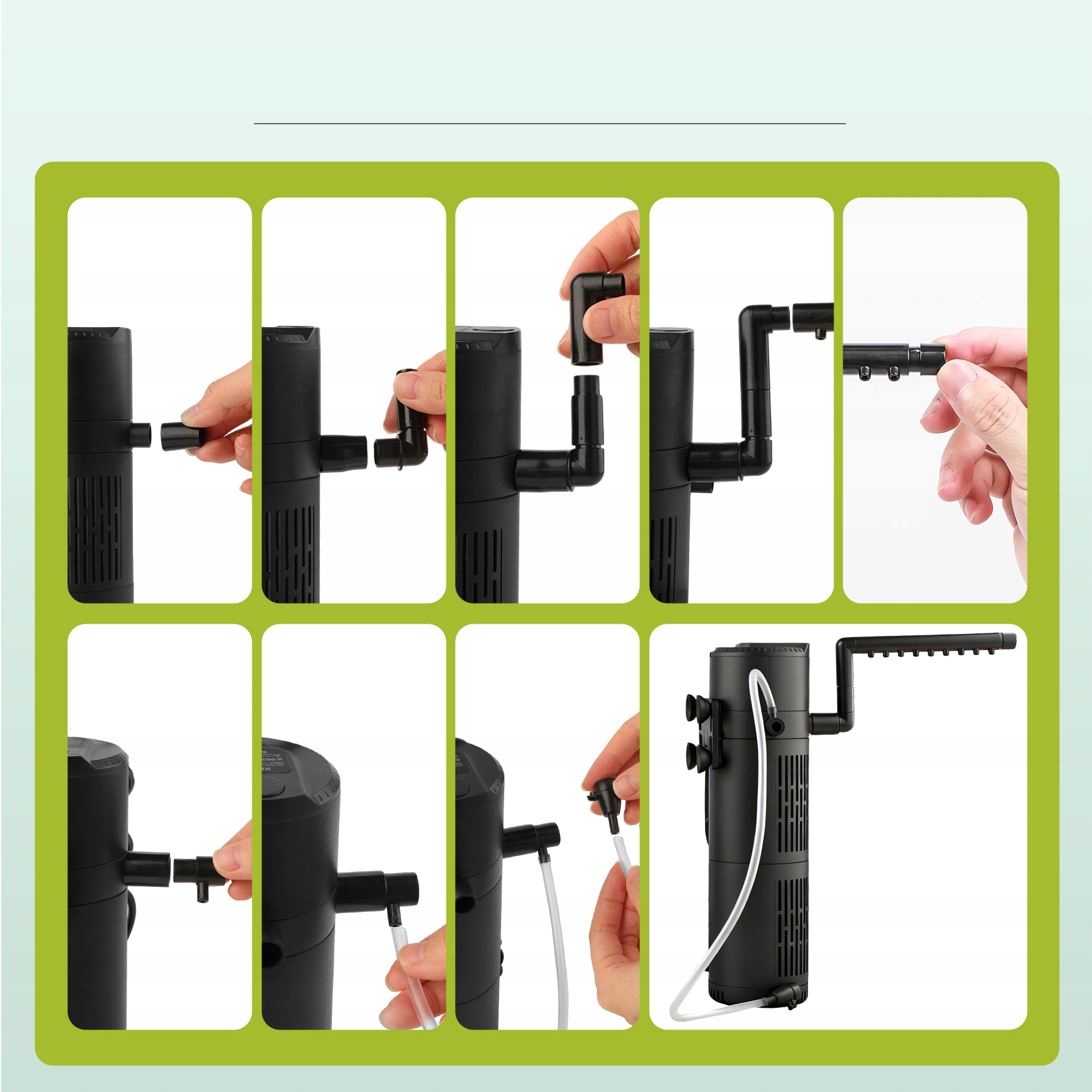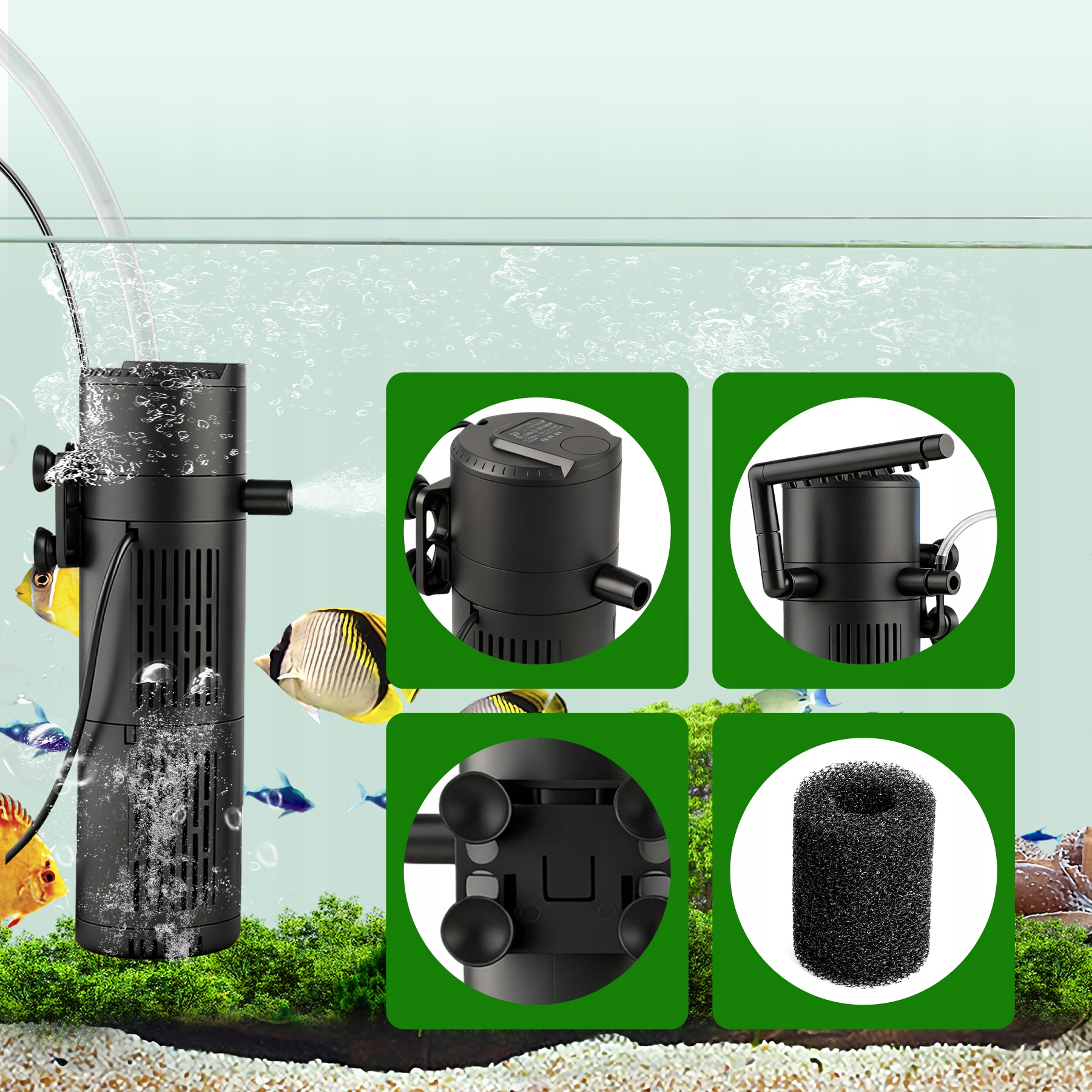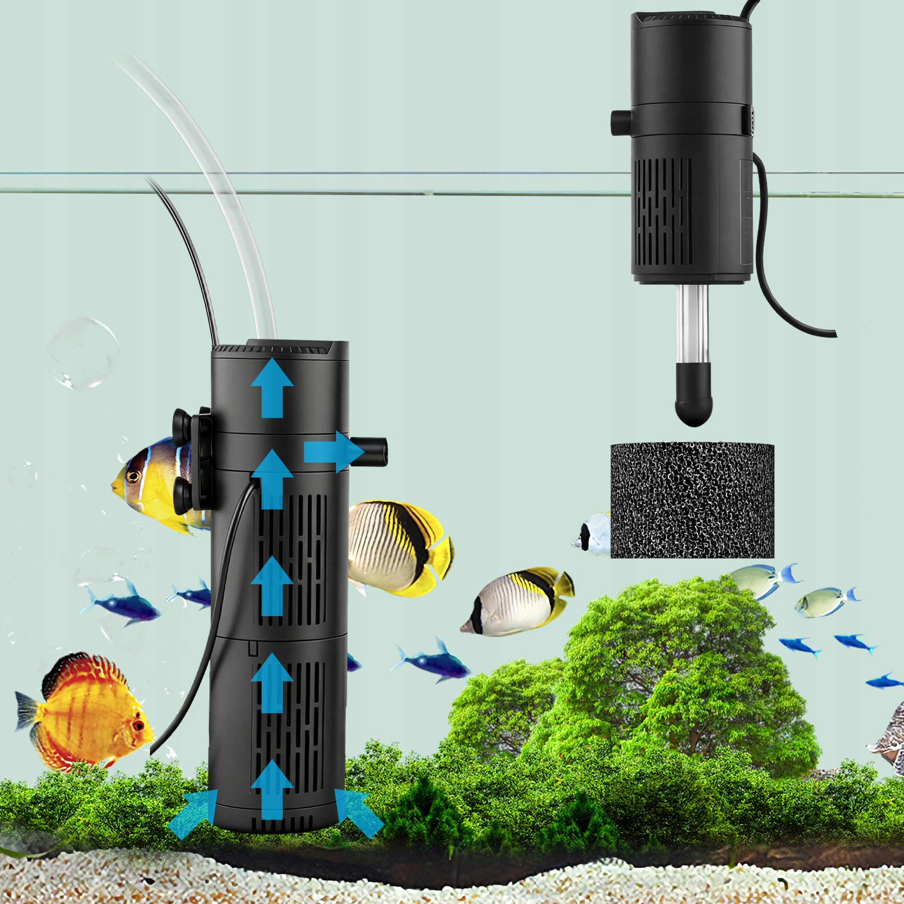 Цей акваріумний фільтр — ефективний акваріумний фільтр — це внутрішній фільтр із УФ-очисником, який, як практичний акваріумний насос, також оптимізує рух води. Його можна використовувати як внутрішній акваріумний фільтр, так і акваріумний внутрішній фільтр, поєднуючи функції циркуляції, стерилізації, оксигенації, функції дощу та формування хвилі, надійно видаляє забруднення та підвищує вміст кисню, створюючи здорове середовище в акваріумі
