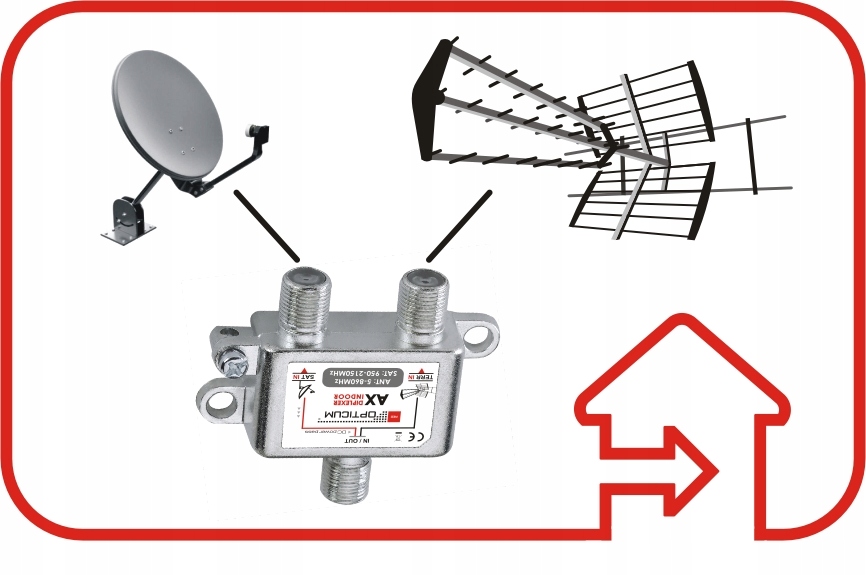Об'єднувач підсумовує сигнал від єдиного конвертера з сигналом ефірного телебачення (внутрішнім). Це дозволяє надіслати комбінований сигнал одному одержувачу. Щоб розділити сигнал наприкінці, використовуйте гніздо RTV/SAT