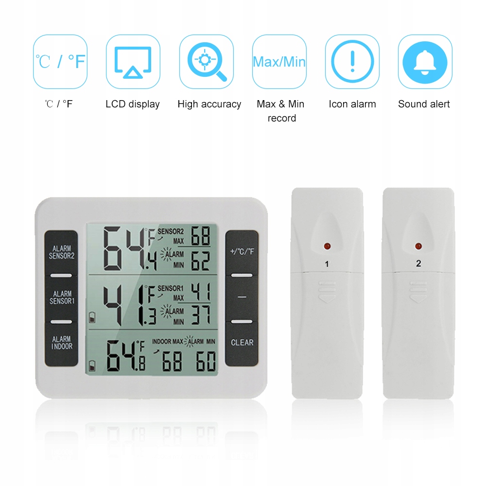 - Цифровий вимірювач температури з бездротовими датчиками підходить для зовнішнього чи внутрішнього використання, наприклад, у вітальні, спальні, дитячій кімнаті, офісі, винному льоху, оранжереї, льосі тощо. Він відстежує три температури (одну з вимірювачем температури, дві з датчиками), фіксуючи зміни в навколишньому середовищі в режимі реального часу.