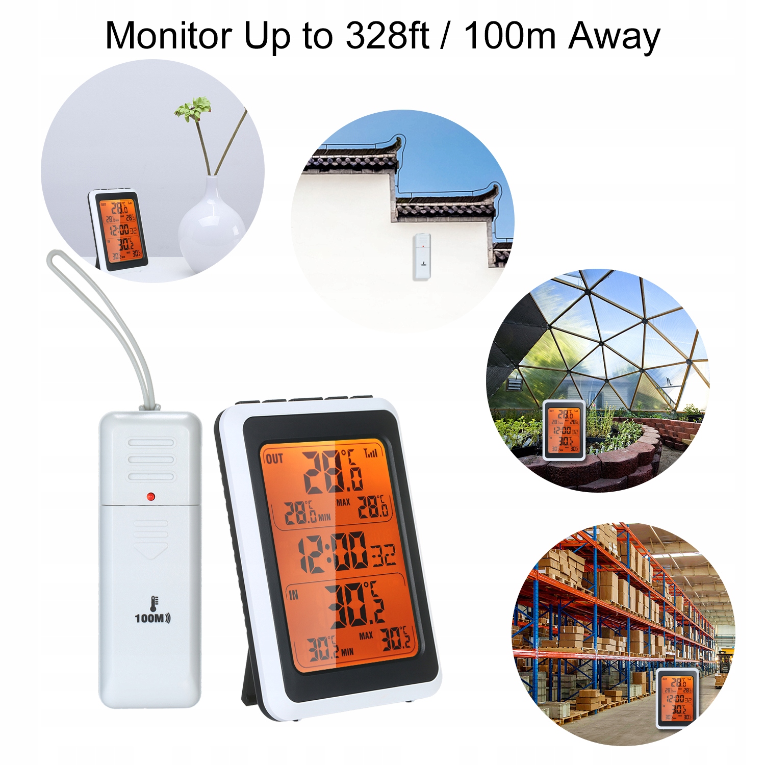 - Бездротовий термометр виявляє температуру кожні 30 секунд у 32 градусах Фаренгейта ~ 122 ступеня Фаренгейта для в приміщенні та -58 ступеня Фаренгейта ~ 158 ступеня Фаренгейта на вулиці. Він показує час, дату та тиждень на одному екрані, з Цельсієм та Ференгейтом, які можна перевантажити, ідеальний індикатор температури для дитячої кімнати, спальні, парникові, підвалі, пішохідну камеру тощо.
