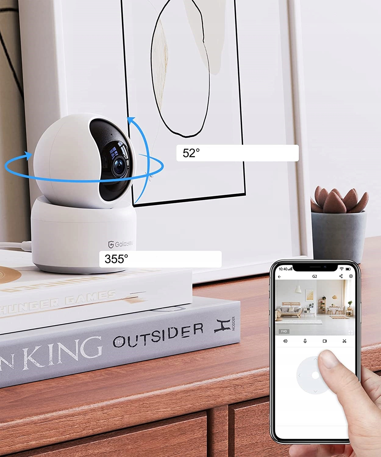 Роздільна здатність 2K і охоплення 360°: внутрішня камера безпеки Galayou забезпечує пряму трансляцію в роздільній здатності 2K Super HD, що дозволяє контролювати ваш тварин або дітей у чітких деталях, обертаючи голову цієї камери безпеки на 355° по горизонталі та 52° по вертикалі через додаток, переглядаючи все зображення вашого дому. Бездротова камера безпеки працює з Wi-Fi 2,4 ГГц (5 ГГц не підтримується)