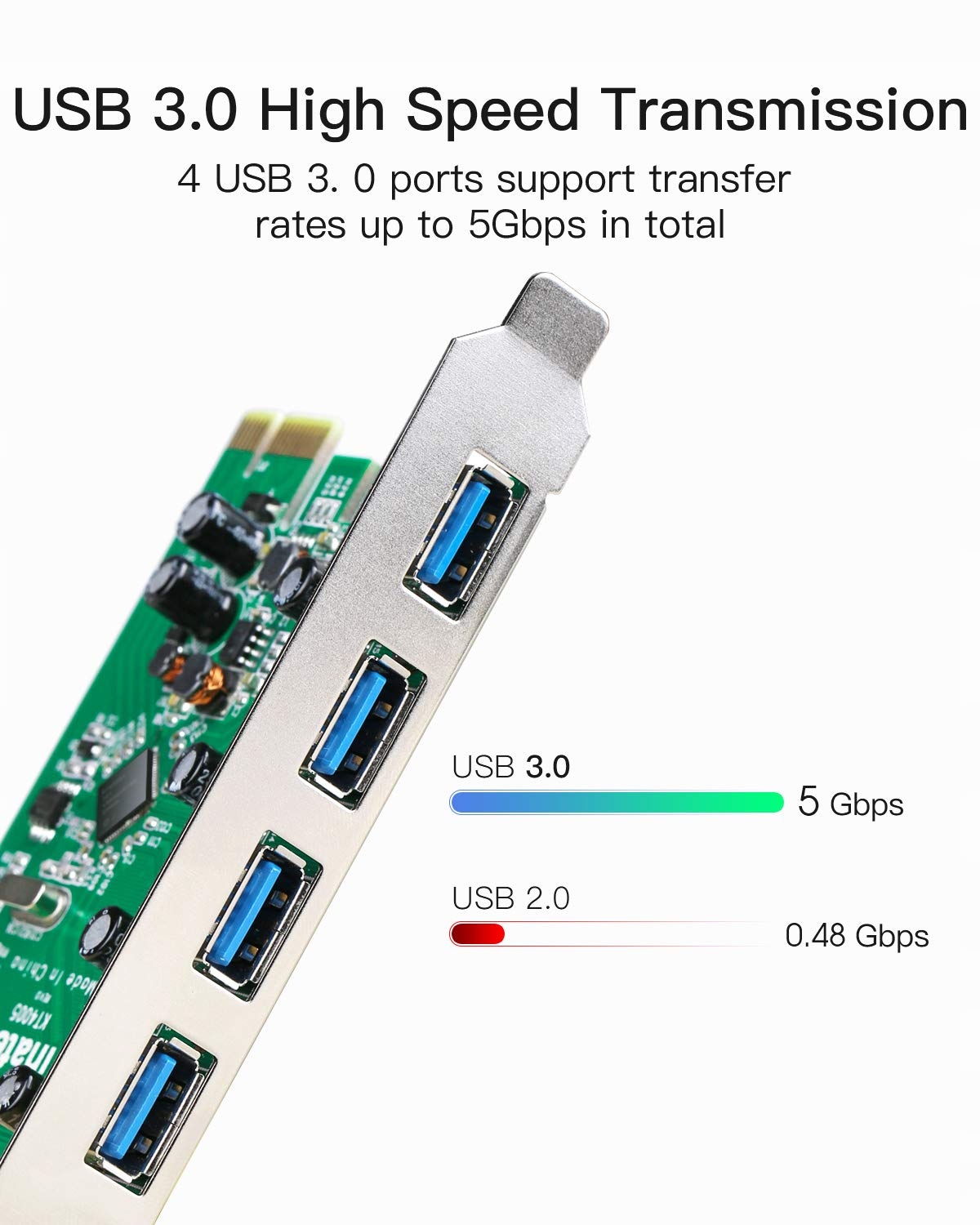 Для нормального розпізнавання та роботи більше не потрібне додаткове живлення; Легко оновіть свій ПК з Windows до USB3.0 за допомогою карти адаптера контролера PCI Express до USB3.0; Підтримує USB Hot Plug, Plug & Play; Низьке енергоспоживання.