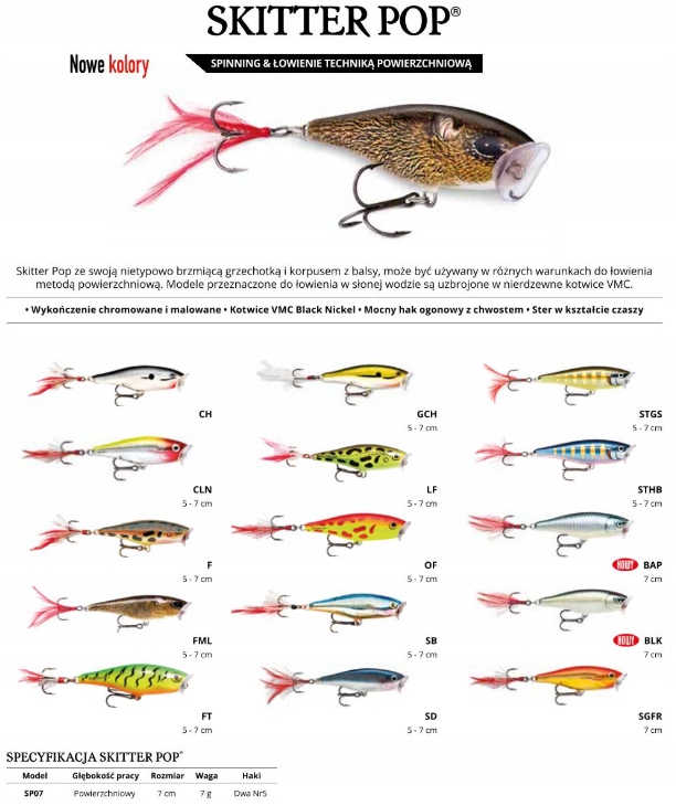 Skitter Pop з бальзовим корпусом, може використовуватися в різних умовах для надводної риболовлі. Моделі, призначені для лову в солоній воді, оснащені потрійними гачками VMC з нержавіючої сталі.